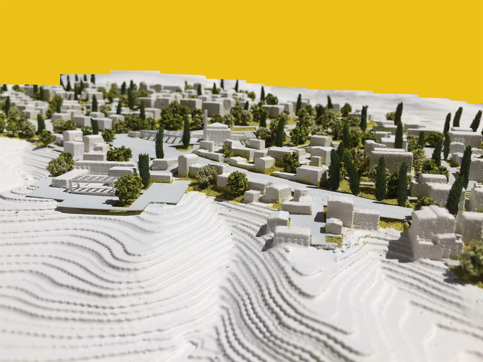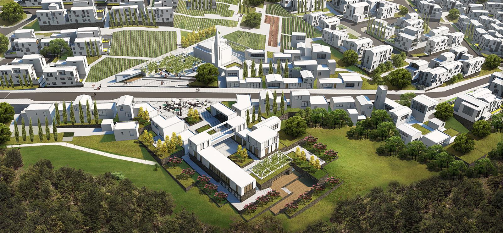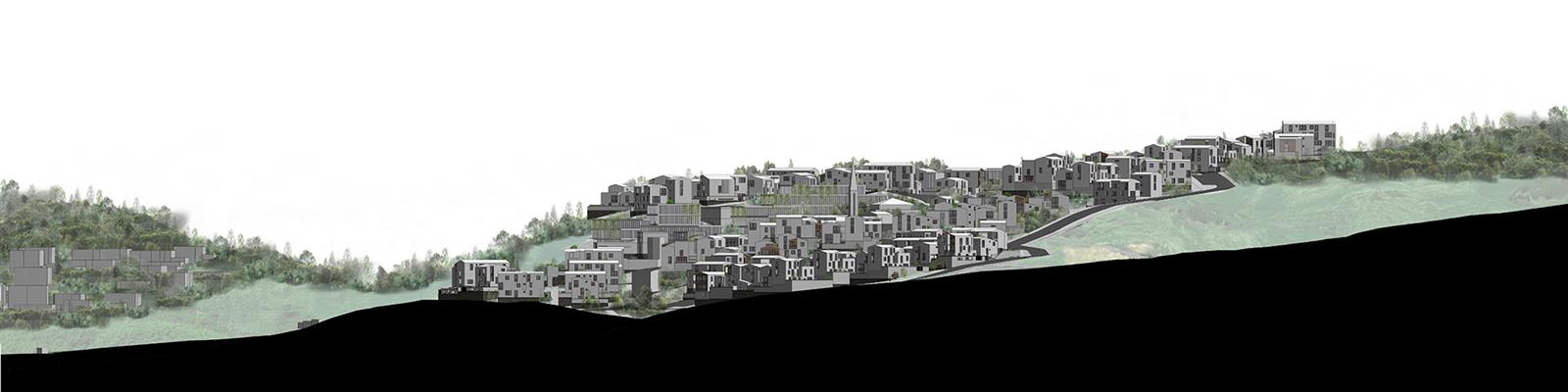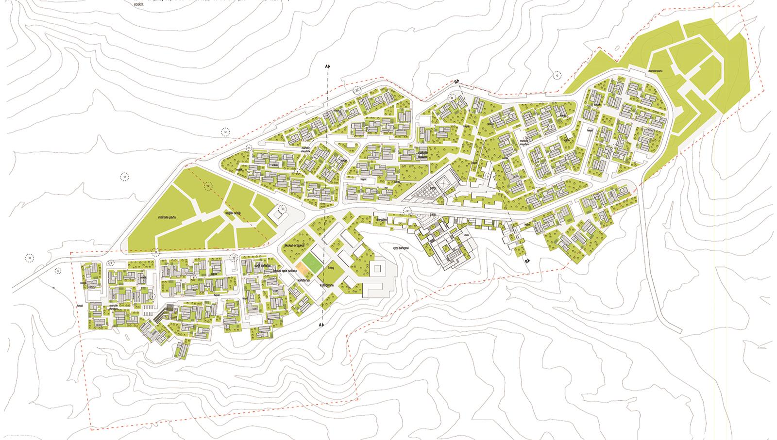 3. OMURGA VE MERKEZİN OLUŞUMU: Alanı ikiye ayıran bu yol tasarıma dahil edilmiş ve iki yanında planlanan çarşı, meydan, cami ve kamusal yapılar grubu ile projenin omurgasını oluşturmuştur. Kamu yapıları ve sosyal mekanlar iki “plato” üzerinde konumlandırılmış, çarşı yolun iki yakasında “yamaç”a doğru sürdürülmüştür. Cami ise çarşı ve meydanla bir bütün oluşturacak şekilde planlanmıştır.