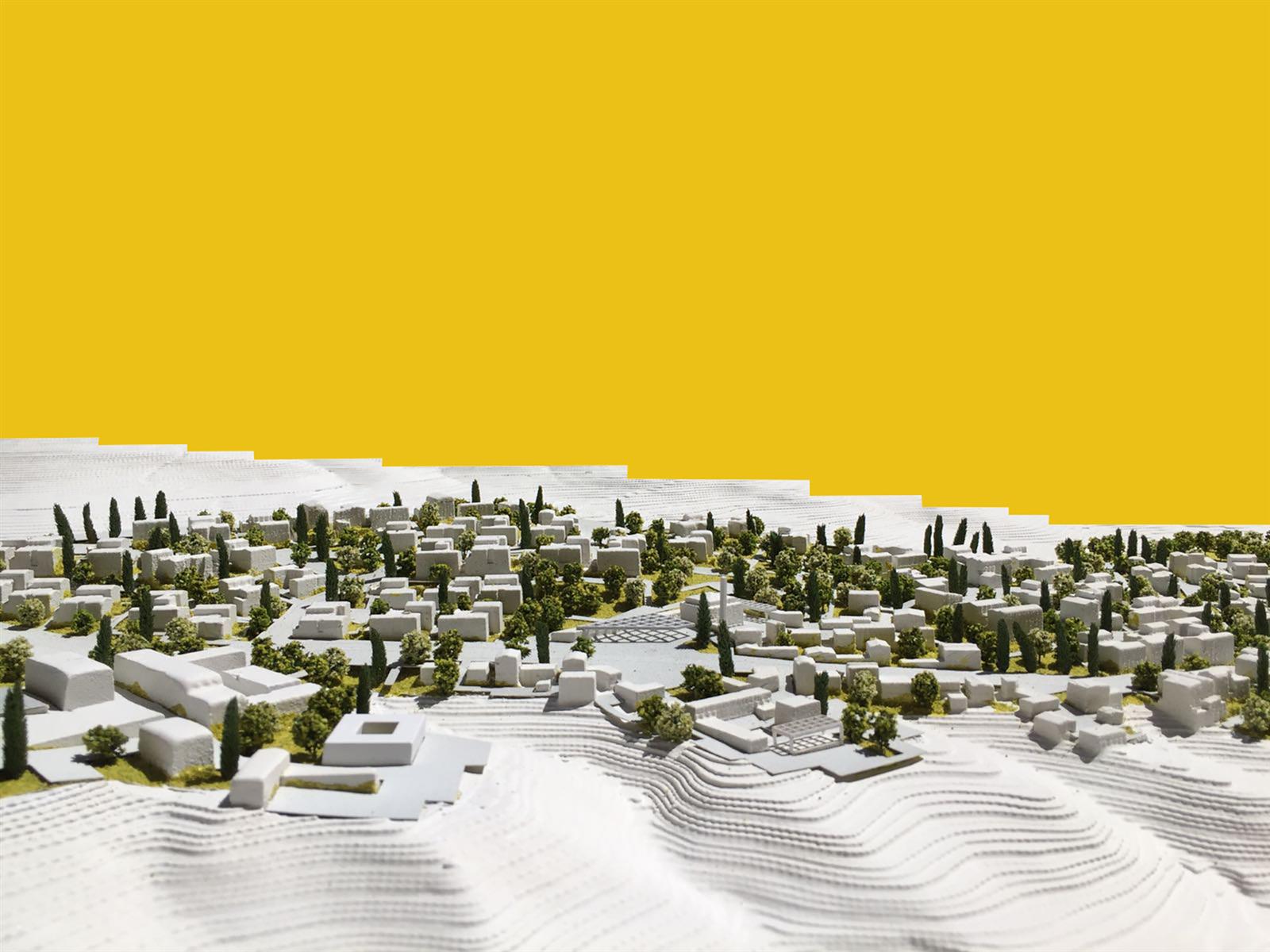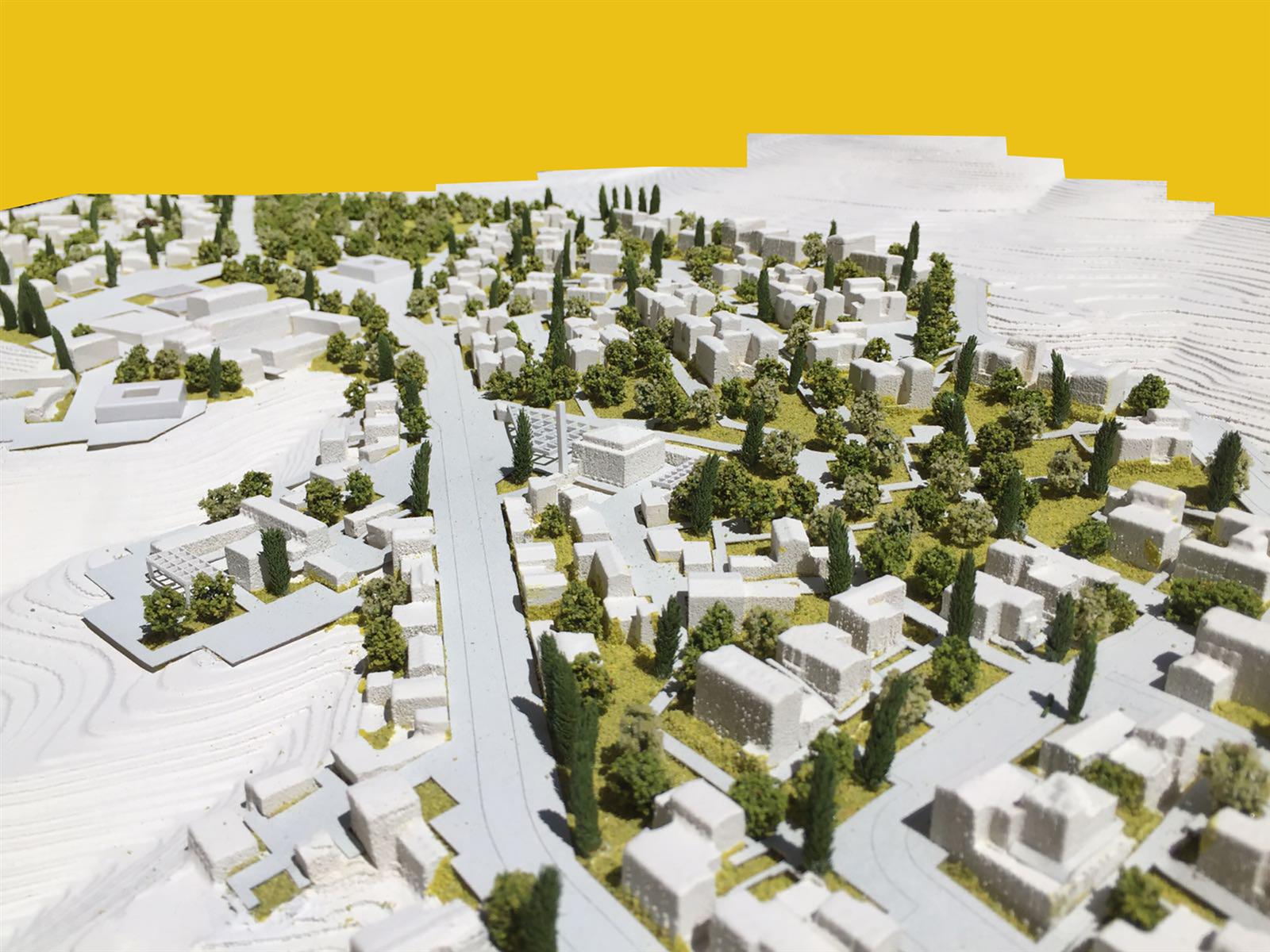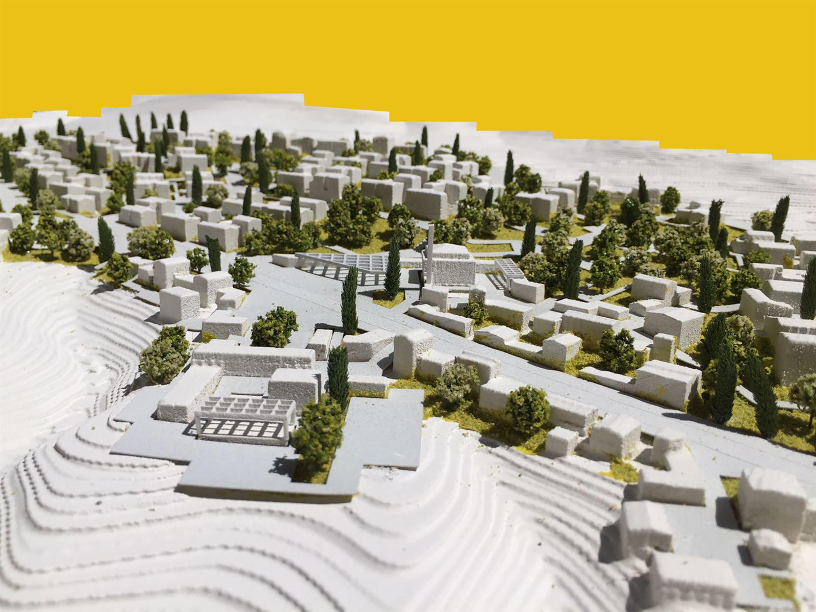 3. OMURGA VE MERKEZİN OLUŞUMU: Alanı ikiye ayıran bu yol tasarıma dahil edilmiş ve iki yanında planlanan çarşı, meydan, cami ve kamusal yapılar grubu ile projenin omurgasını oluşturmuştur. Kamu yapıları ve sosyal mekanlar iki “plato” üzerinde konumlandırılmış, çarşı yolun iki yakasında “yamaç”a doğru sürdürülmüştür. Cami ise çarşı ve meydanla bir bütün oluşturacak şekilde planlanmıştır.