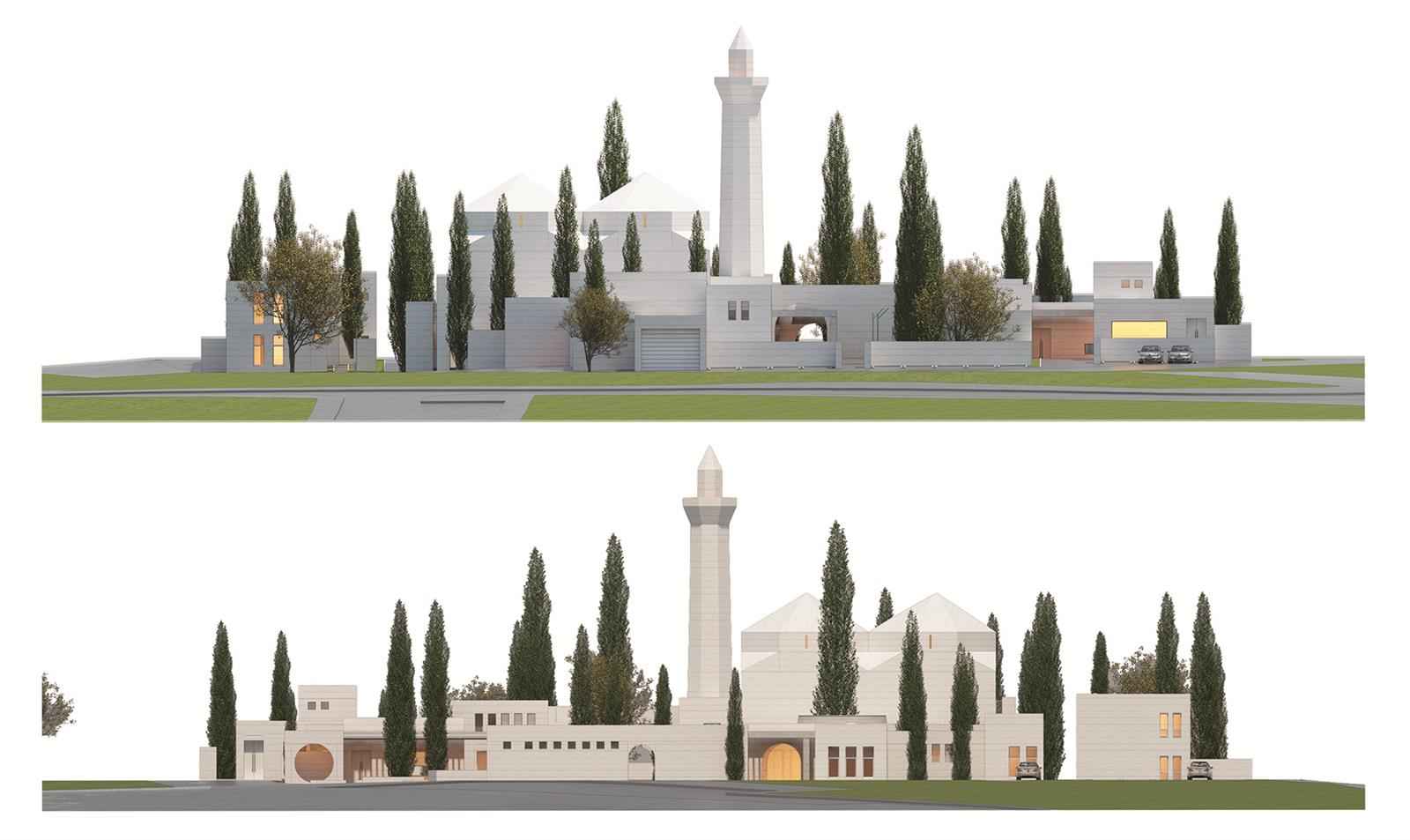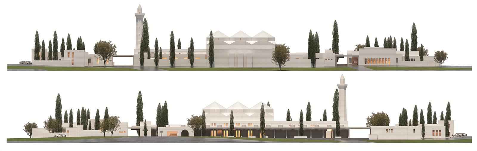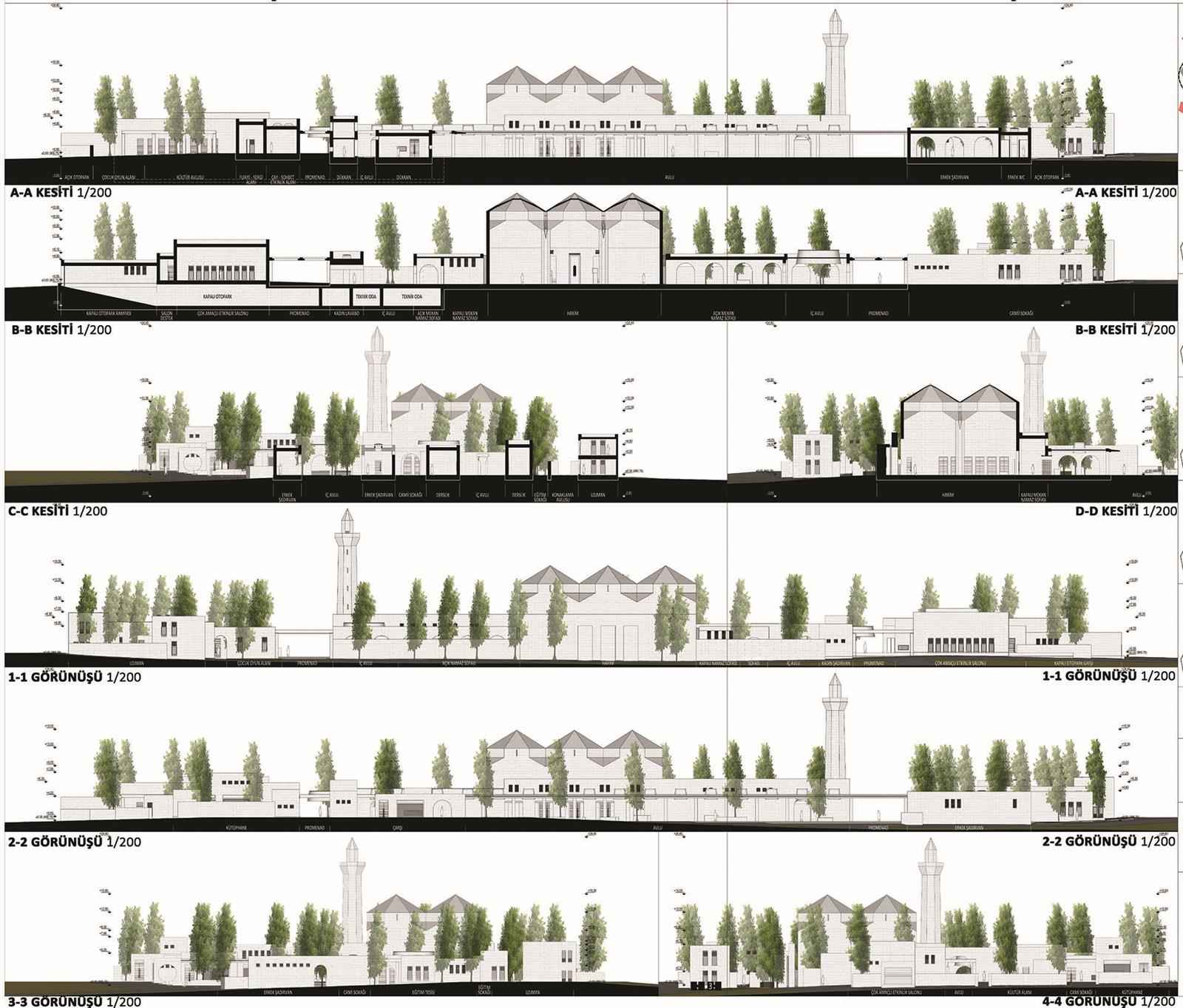 Kütle Kararları; Tasarımda yapı gruplarının toprağa yatay yerleşimine karşılık parçalı şakuli plastik etkisi de düşünülmüş ve tasarıma yön veren ana kararlardan birisini teşkil etmiştir. Cami harim ve sofaları bölgenin karakterine uygun olacak şekilde çok ayaklı camilere öykünen ve piramidal bitecek şekilde kurgulanmıştır. Kemerli açık sofalar ve yarıklar açılan Harim gövdesi bölge kültür ve iklimine uygun olacak şekilde kurgulanmıştır.