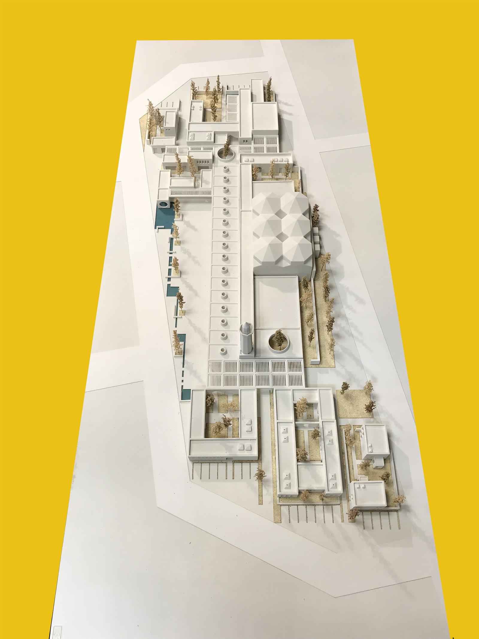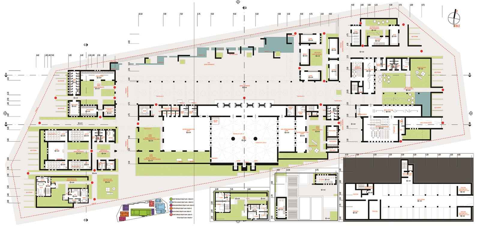 Tasarım alanına üst ölçekte bakıldığında tepede konumlandığı; sosyal kamusal mekanlar, yeşil alanlar ve de ticaret/konut birimlerince çevrelendiği görülür. Sosyal kamusal mekanlar öbeğinin odağında yer alması bir bütünleyiciliğin yanı sıra geçirgenliğin de gerekliliğini ifade eder. Kamuya terk edilerek oluşturulacak boşluk kadar az katlı gölgelikli mekanları da çağırır. Araç trafiğine kapatılan yollar kesintisiz bir yaya konforu sağlar. Kullanıcısına hizmet eden insan ölçeğinde mekanlar kurgulanır. Bu mekanlar yarı açık gölgeliklerle desteklenir ve arkadlarla birbirlerine bağlanır. Yapılar bütünü, geçirgenlik görevi ile üst ölçekte sosyal kamusal mekan ağının bir parçasını oluşturur.