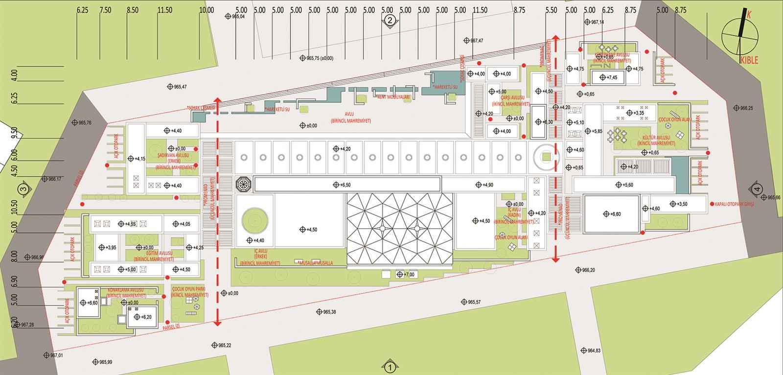 Her bir avlu insan yürüme konforu açısından optimum mesafede konumlanmışlardır. Merkeze caminin alındığı 6 zondan (avlulu yapı öbeği )oluşmaktadır. Bu değişken büyüklüklerdeki 6 farklı merkezde konut avlusu, eğitim avlusu, şadırvan avlusu, kültür avlusu, kütüphane avlusu ve ticaret avlusu yer alır. Gerekli yerlerde sokak çeşmesi, su ögesi gibi birimler ile sosyal hayat desteklenmiştir. Tasarım alanında belirlenen ana akslarda, mahallelinin bisiklet, koşu, yürüyüş gibi bir çok sosyal ve kültürel aktivitesini yapabilmesi için promenad oluşturulmuştur. Yapı adasının sosyal kamusal yapı öbeği ile ilişikli geniş cepheleri araç trafiğine kapatılmıştır. Yapıya ulaşan araçlar kısa çeperlerde park halini alacak ya da kapalı otoparka inecektirler. Acil durumlar için (ambulans, itfaiye, cenaze aracı…) kontrollü yollar kurgulanmıştır. Mevcut yollar üzerinde araç/motosiklet/bisiklet park yerleri kurgulanmış ve kısa yürüyüşler ile kullanıcıların camiye ulaşmaları sağlanmıştır. Araç, bisiklet ve motosiklet park ihtiyacı, çeperlerde oluşturulan cepler ve her eve kısa yürüme mesafesinde bırakılan açık otopark alanları ile sağlanmıştır. Engelliler için kesintisiz hareket kabiliyeti düşünülmüş ve eğimler ayarlanmıştır.