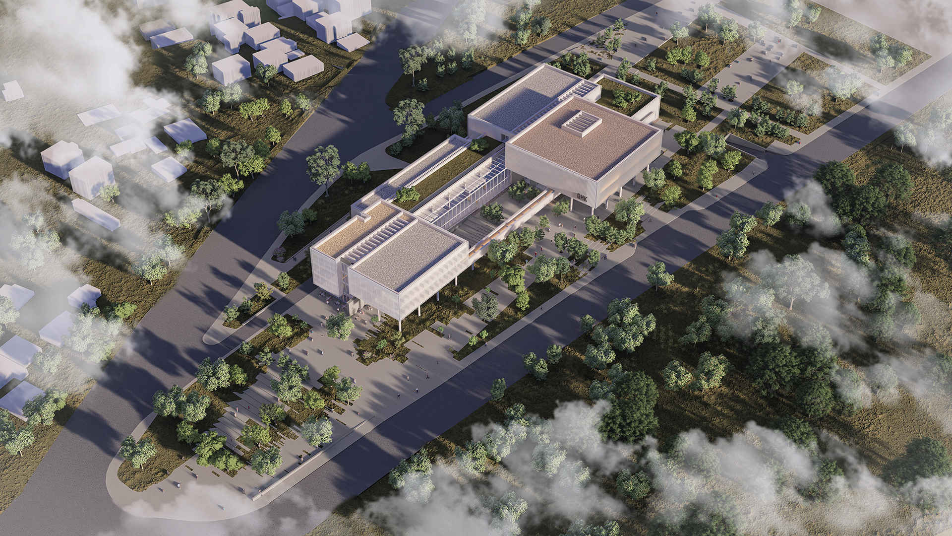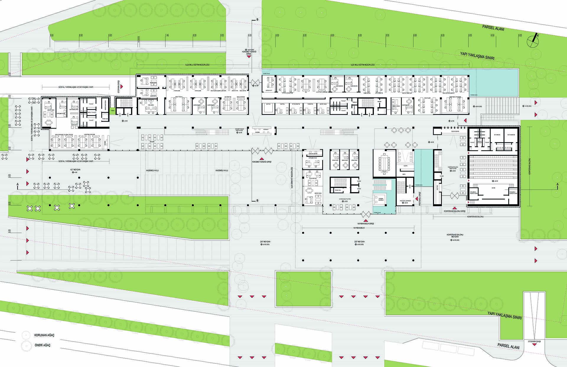 Yapı tasarım kararları alınırken en bağlayıcı refleks kullanıcı davranışlarıdır. Tasarım alanına şehir merkezi yönünden gelecek olan kullanıcı erişimi önemsenmiş olup, millet bahçesine yöneliş ve mevcut ağaç dokusu kütle yerleşiminin başlıca belirleyicileri olmuştur. Yapı kütlesi, parselin batı ucundaki daralan üçgen alandan geriye doğru çekilerek konumlanır ve burada oluşan meydan ile kent merkezi yönünden ve kuzeydeki konut bölgelerinden alana gelen kullanıcıyı karşılar. Alanın kuzeyindeki mevcut ağaç dizisine yaslanan kütle, ayaklar üstünde zeminden yükselerek alt meydanda oluşan kamusal açık alanı proje alanı boyunca, yayvan merdiven ve rampalarla sırasıyla kademeli avlu, üst meydan ve konferans salonu meydanından geçirerek parselin doğusundaki park ve kuzeyindeki ticaret alanları ile bağlar. Yapı programı yoğun olmasına rağmen arazinin eğimine göre, ağaçların tanımladığı boşluklara parçalı bir şekilde yerleşen yapı kütlesi, bina programının gerektirdiği kapalı alanda kurulması gereken mekansal ilişkileri sağlarken, volümetrik kompozisyonu sayesinde de yerin ölçeğiyle daha uyumlu bir durum oluşturur. Parçalı kütle kurgusu yapı programına göre şekillenmiştir. Kullanım yoğunluğu ve birbirleriyle ilişkilerine göre birimler öbeklenmiştir.