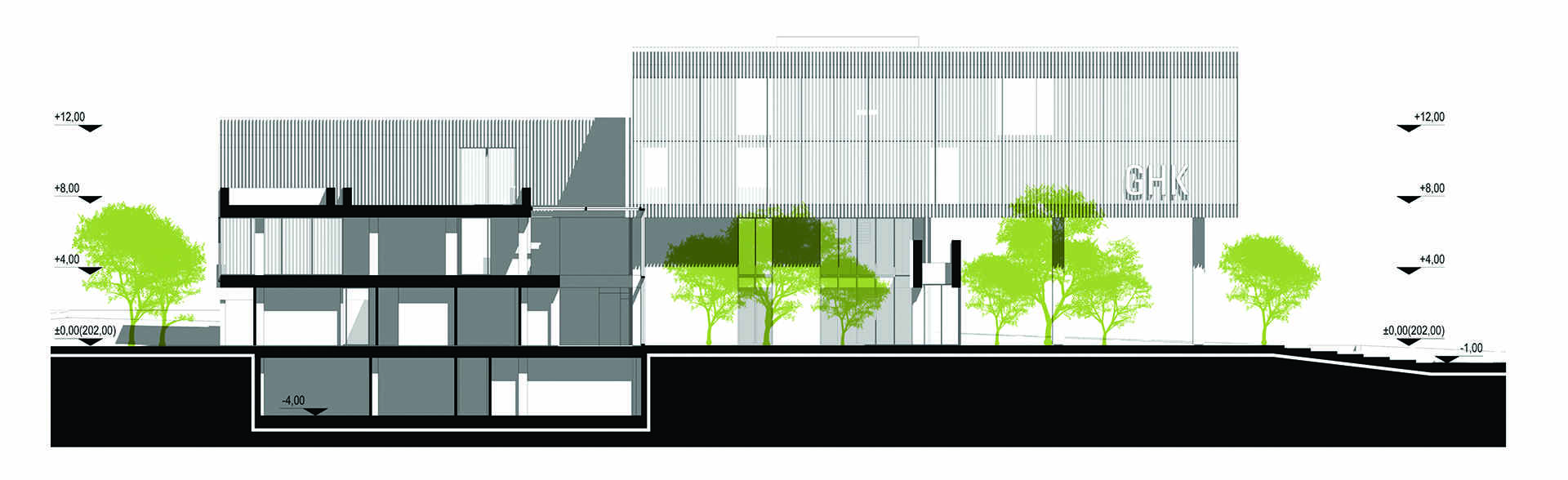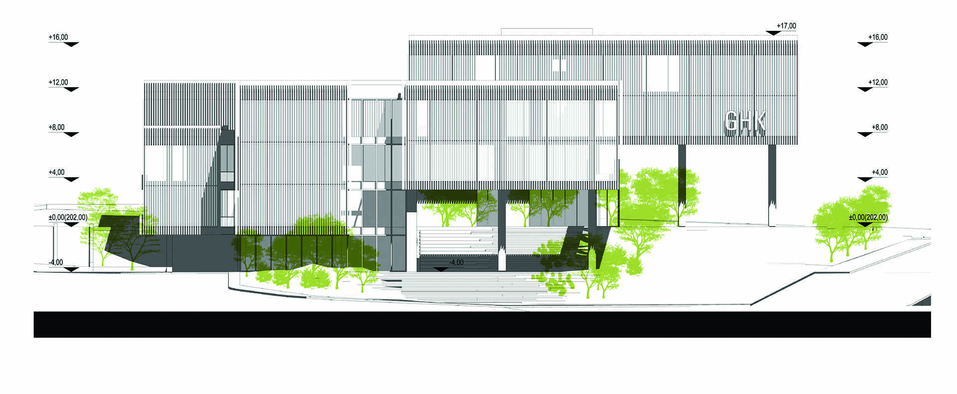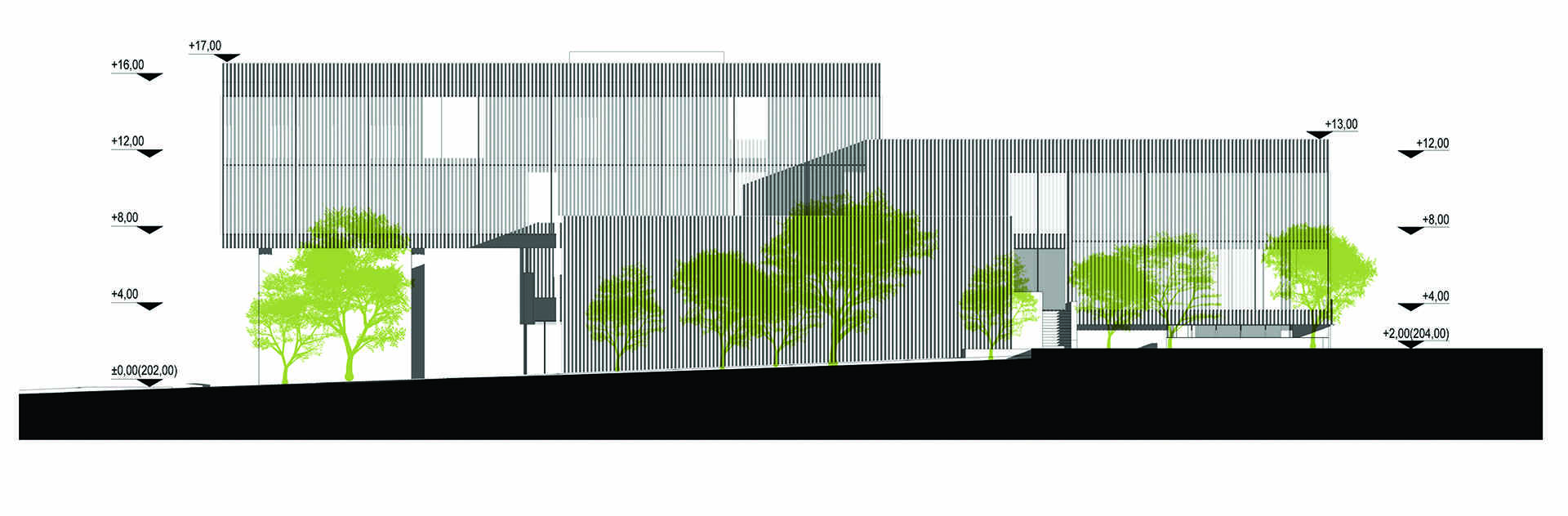 Cephe kurgusunda, yerin endüstriyel kimliğinden ilhamla, metal çubuk elemanlar kullanılarak, kütle kompozisyonunu öne çıkarır bir biçimde yalın ve soyut bir dil tercih edilmiştir.