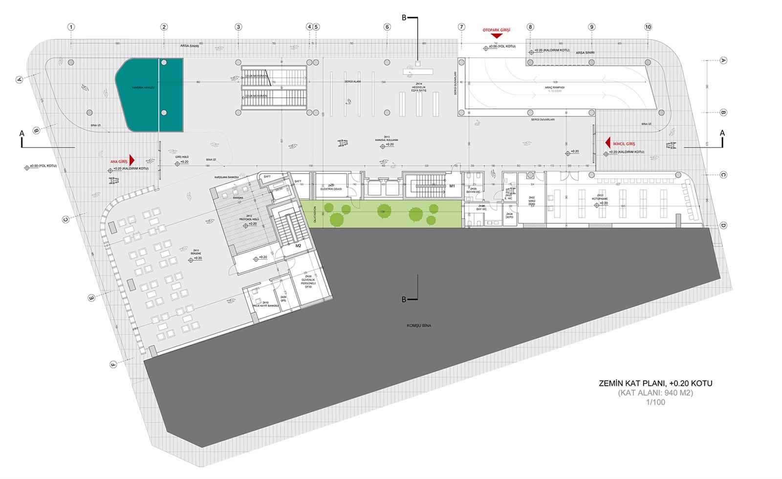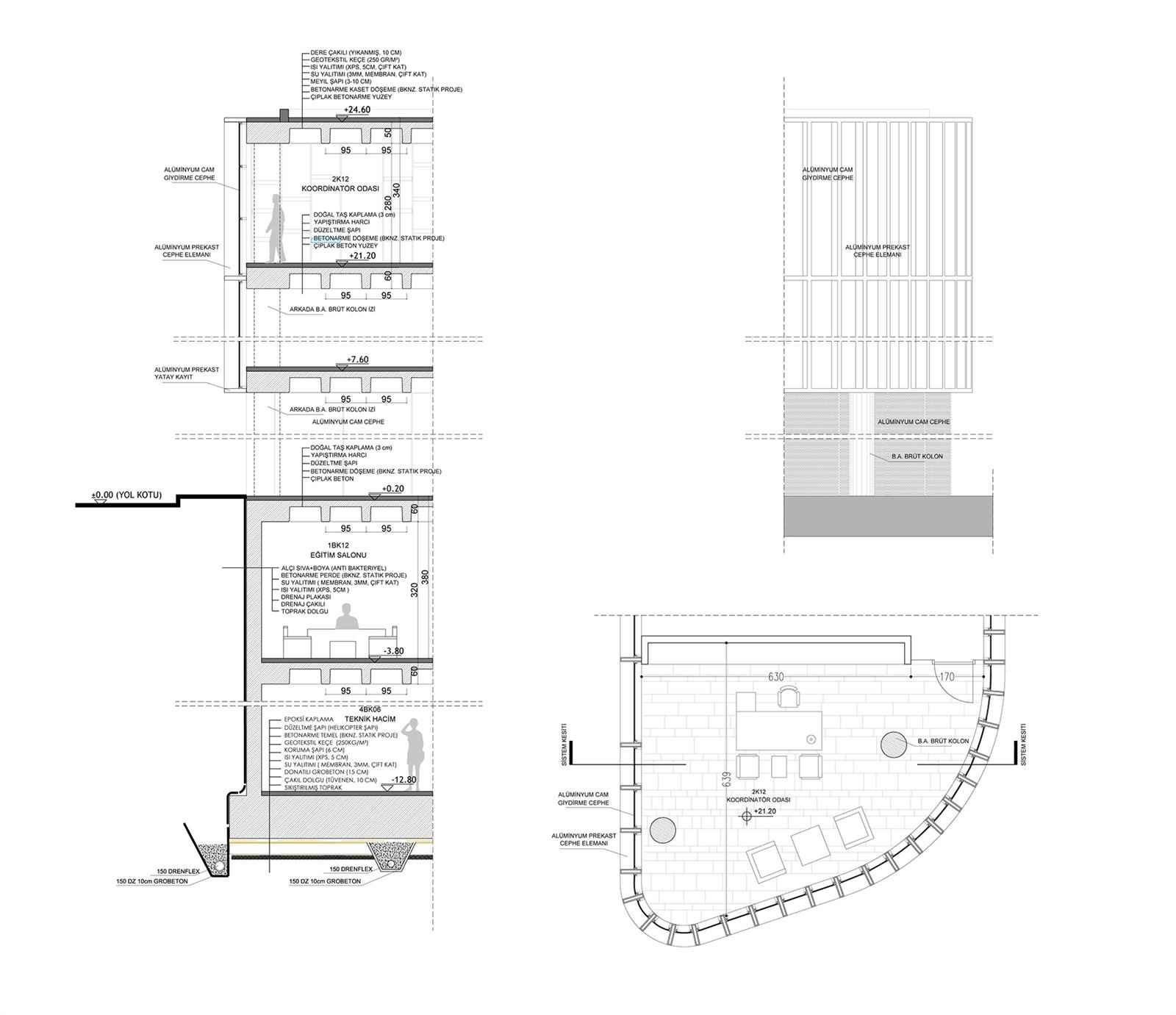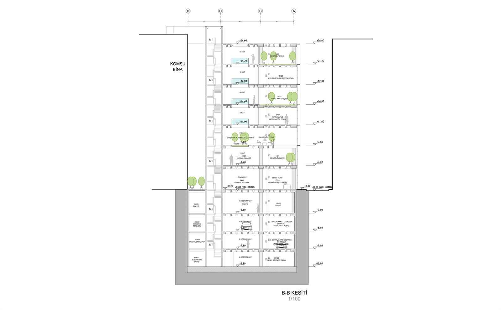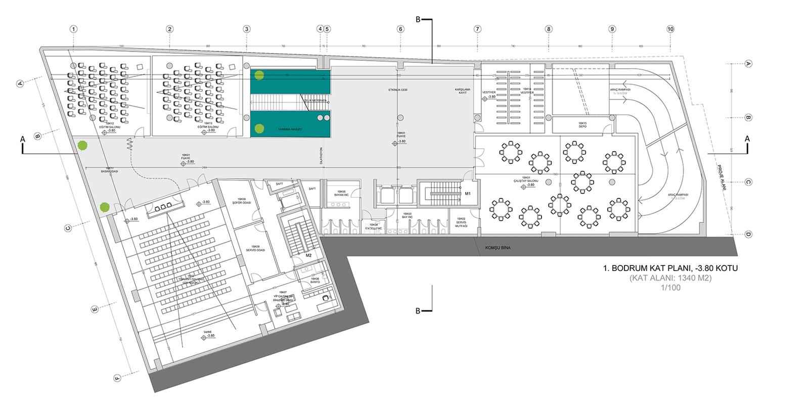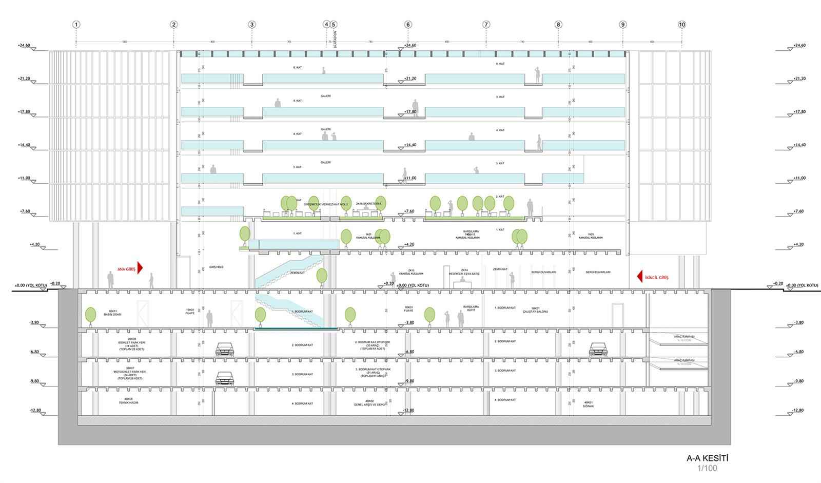 Toplantı salonları ise İZKA faaliyetlerinin yanı sıra ileriye dönük olarak kamusal kullanım potansiyelinin, kente kültürel aktiviteler anlamında sağlayacağı imkanlar göz önüne alınarak girişle ilişkili ve geçişi kontrollü olacak şekilde -4,00 kotunda çözülmüştür. Otopark, teknik hacimler, arşiv ve depolar da bodrum katlarda konumlandırılmıştır.