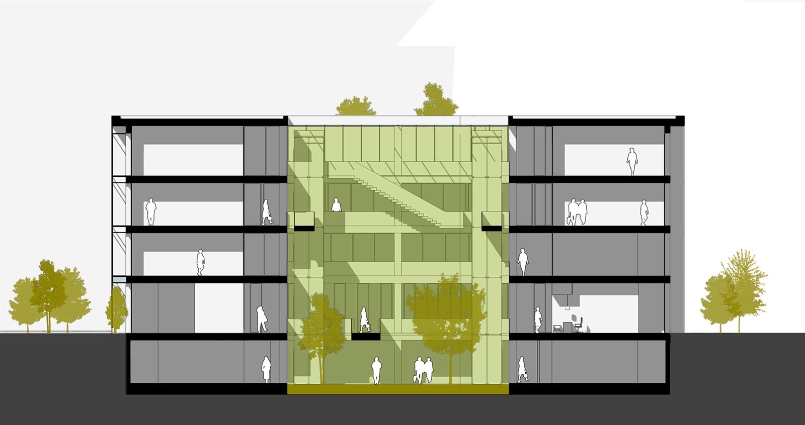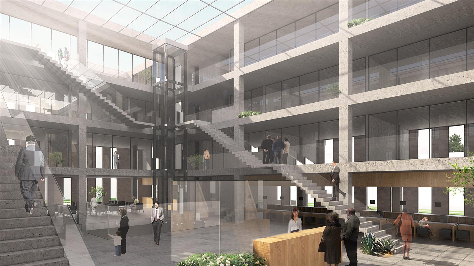 İkinci Zone, yapı adasını ikiye bölen sokağın batı kısmıdır. Bu bölge Ticaret Odasının avlulu ofislerini ihtiva eder. Ofisler avlu içerisinde lineer devam eden koridor ve sirkülasyon alanlarının beslediği birimlerdir. Avlu içe dönüklüğü ile kontrollü doğal ışık ve havalandırma açısından maksimum konforu hedeflemiştir.
