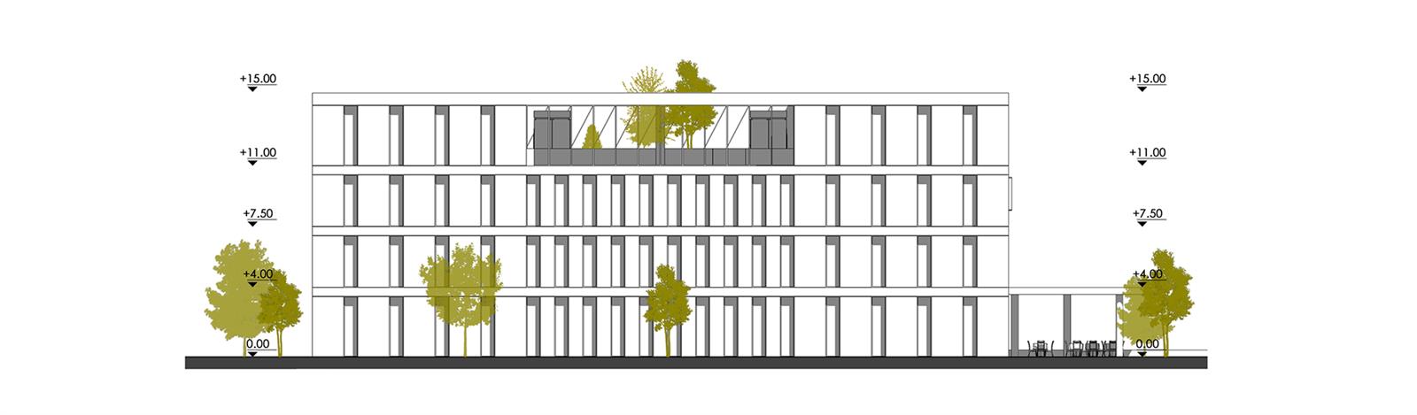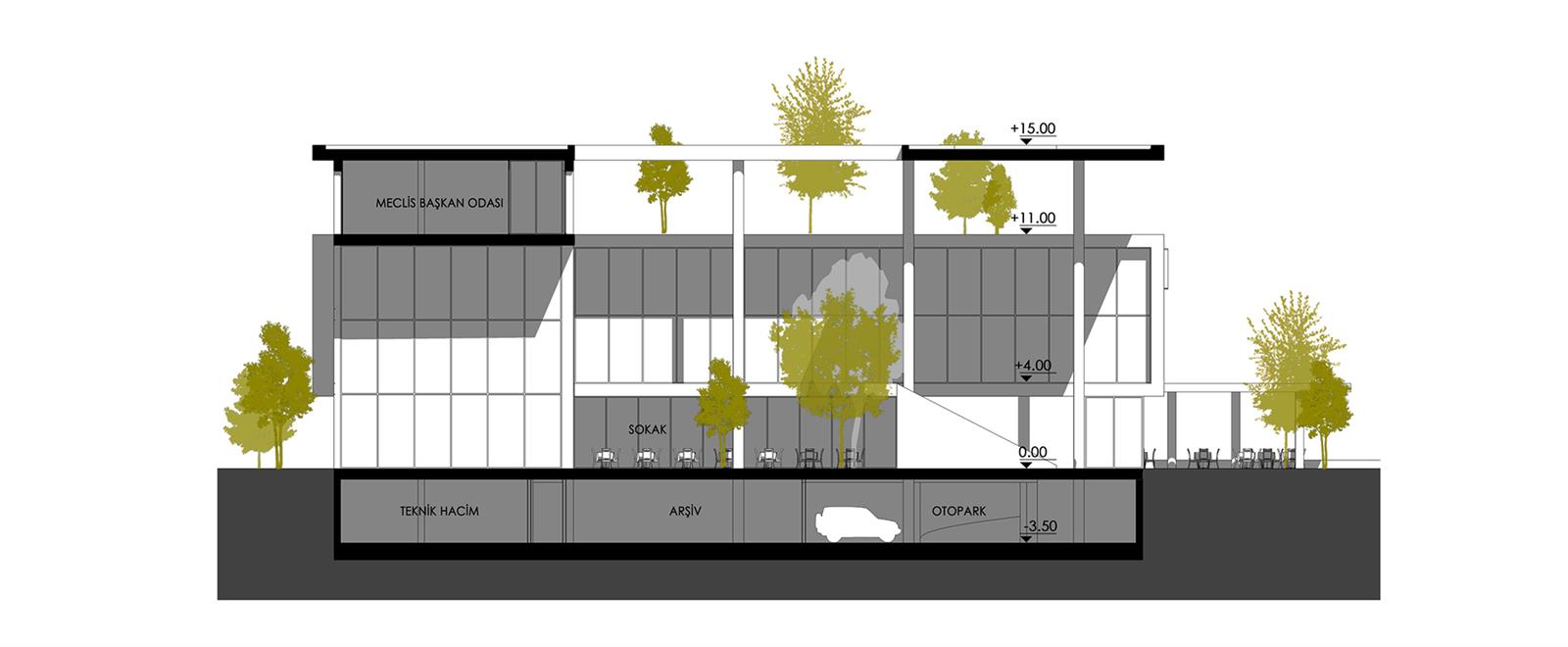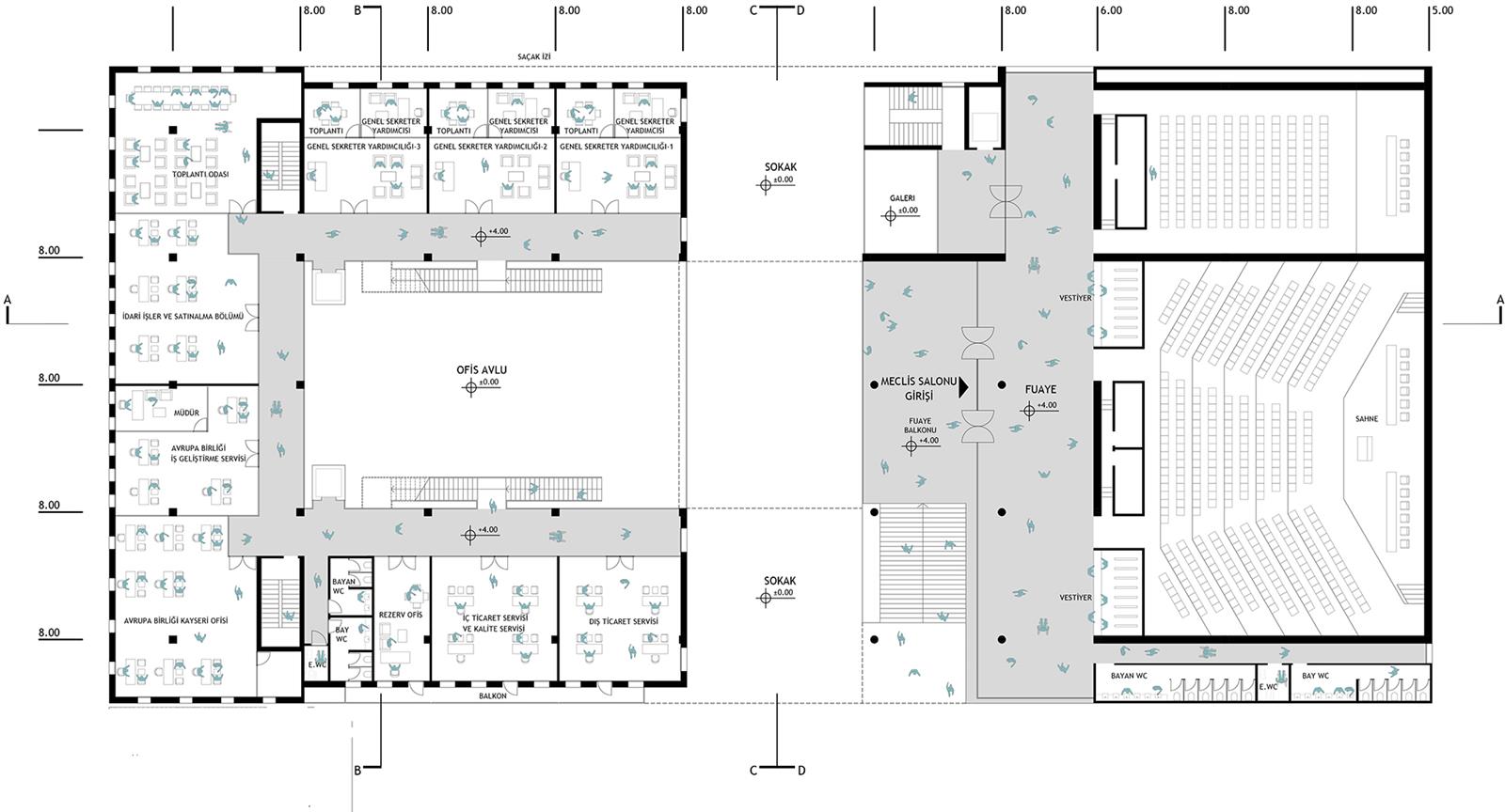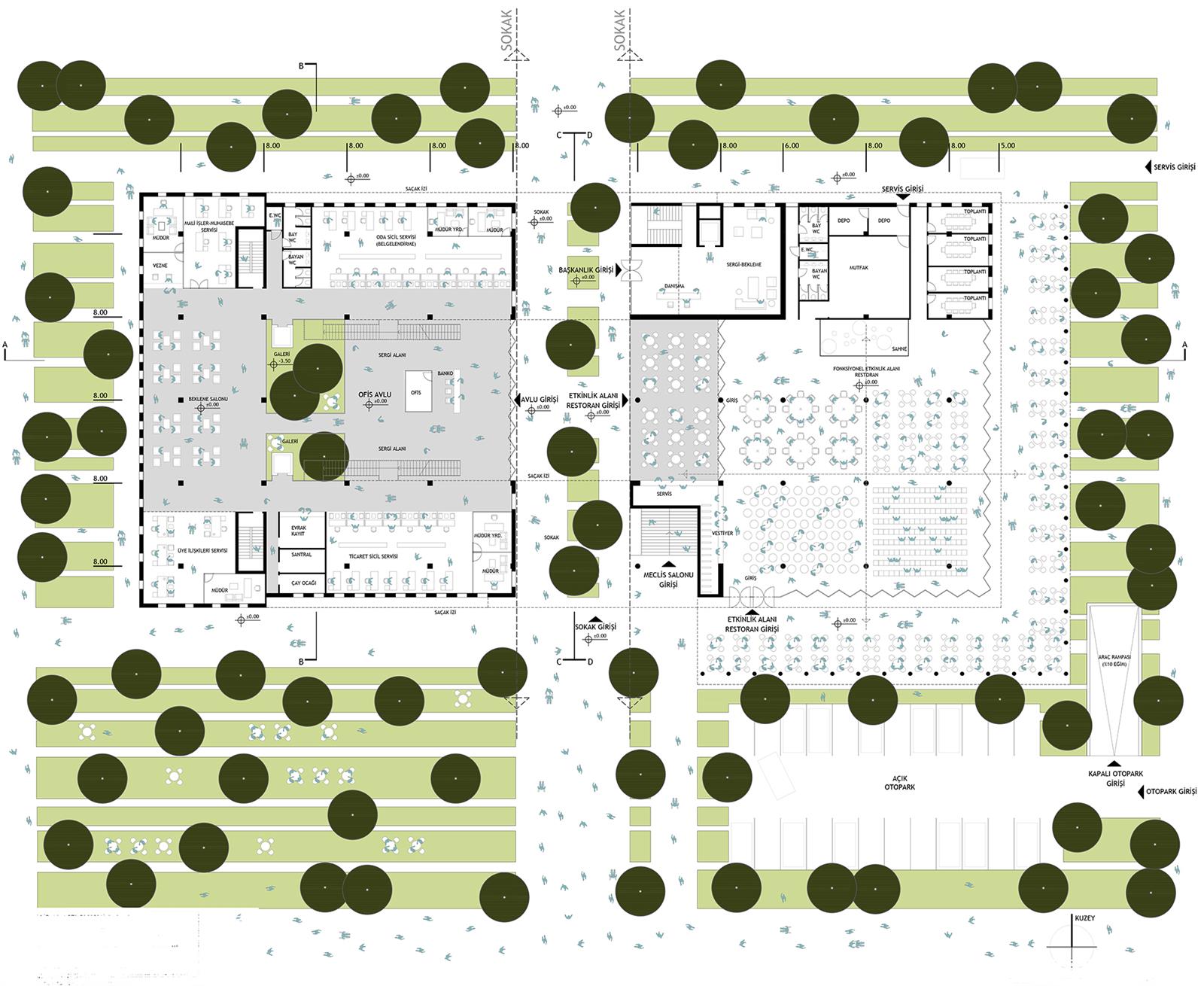Zemin katta tasarlanan çok amaçlı etkinlik salonu restoran istenildiğinde sokak ve bahçeye taşabilecek biçimde çok maksatlı olarak kurgulanmıştır. Bu bütünleşmede bölge iklim koşulları da göz önünde tutularak açık/yarı açık arkadlar bölgenin güney ve doğu çeperini sararak bu konforu desteklemektedir.