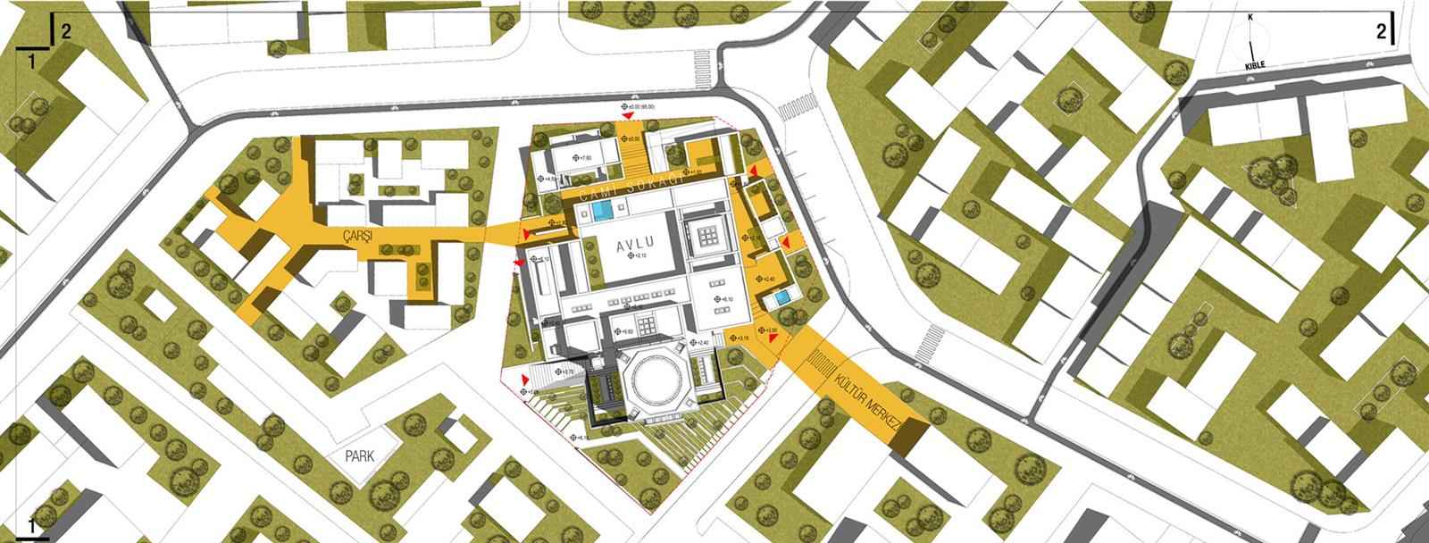 Çevresindeki çarşı, kültür merkezi, yeşil alan ve konutlarla temas halinde olan cami alanı bir “düğüm noktası” (Şekil-5) oluşturur. Mahallenin odağındaki proje alanı mahallenin kamusal yaşantısına katkı sağlayabilecek bir pozisyondadır. Cami alanının bu potansiyelini ortaya çıkarmak için camiyi kentsel süreklilik içerisinde ele alıp çevresiyle olan etkileşim yüzeylerini artırmak hedeflenmiştir. Buradan hareketle cami alanına her noktadan erişilebilen, “çok girişli” bir senaryo öngörülmüştür.