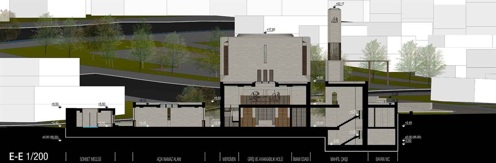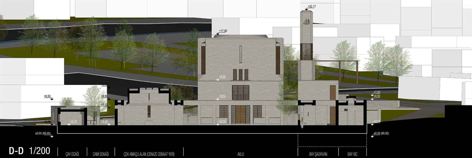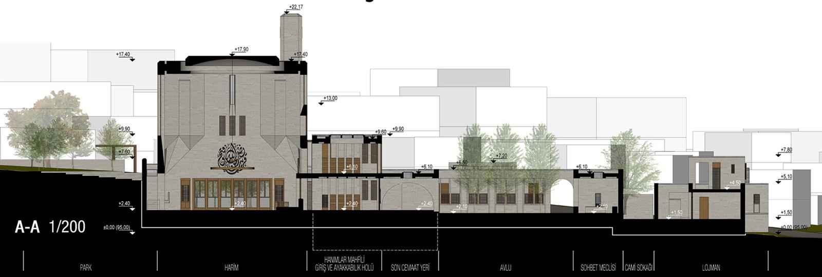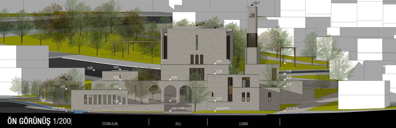 Plan okumasında bahsedilen burada yapılacak olan caminin “merkez camisi” niteliğinde olacağı çıkarımından hareketle verilen ihtiyaç programı yorumlanarak ele alınmıştır. Çarşı-kültür merkezi aksında oluşturulan oturma alanlarına çay kahve servisinin yapılabileceği bir çay ocağı önerilmiştir. Ayrıca cuma, bayram, teravih namazlarında cemaatin dışarıya doğru genişleyebileceği şekilde son cemaat mahalinin uzantısı şeklinde “açık namaz kılma alanı” ve “çok amaçlı saçak” önerilmiştir. Önerilen çok amaçlı saçağın altına gereken durumlarda cami cemaatinin taşabileceği gibi cenaze namazları kılınabilecek, Kur’an kursu öğrencileri için bir teneffüs ve oyun avlusu olabilecek, ramazan aylarında mahallelinin topluca iftar yapabileceği iftar sofraları kurulabilecektir.