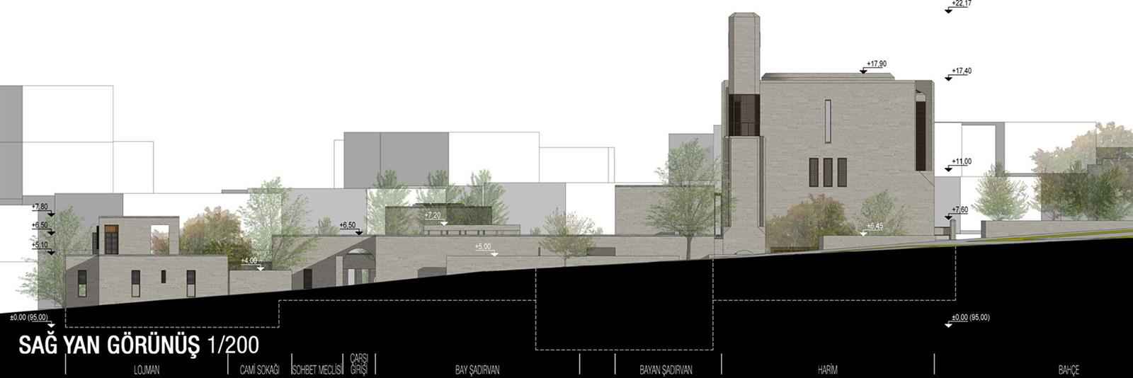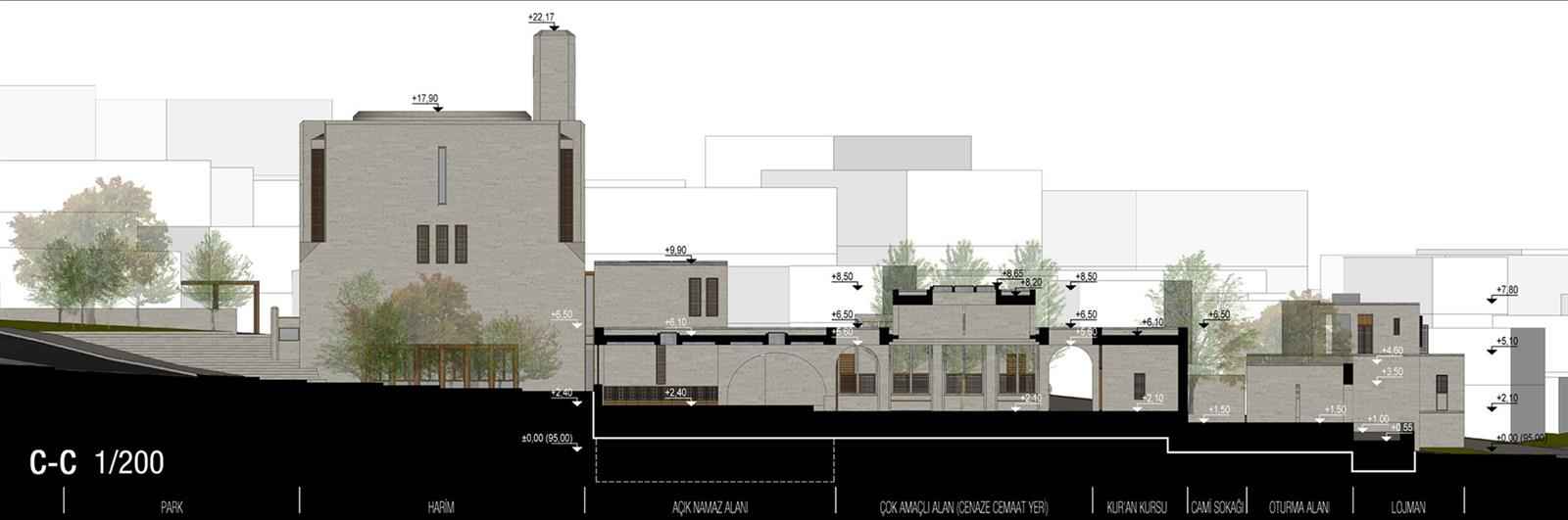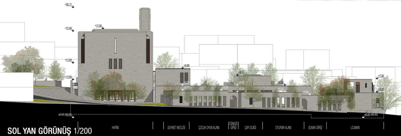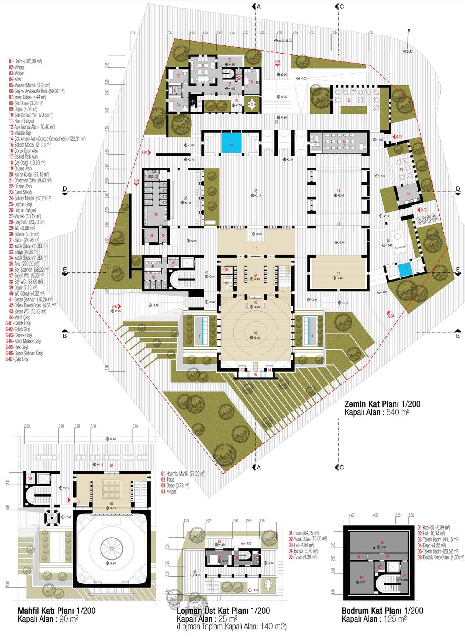 Plan okumasında bahsedilen burada yapılacak olan caminin “merkez camisi” niteliğinde olacağı çıkarımından hareketle verilen ihtiyaç programı yorumlanarak ele alınmıştır. Çarşı-kültür merkezi aksında oluşturulan oturma alanlarına çay kahve servisinin yapılabileceği bir çay ocağı önerilmiştir. Ayrıca cuma, bayram, teravih namazlarında cemaatin dışarıya doğru genişleyebileceği şekilde son cemaat mahalinin uzantısı şeklinde “açık namaz kılma alanı” ve “çok amaçlı saçak” önerilmiştir. Önerilen çok amaçlı saçağın altına gereken durumlarda cami cemaatinin taşabileceği gibi cenaze namazları kılınabilecek, Kur’an kursu öğrencileri için bir teneffüs ve oyun avlusu olabilecek, ramazan aylarında mahallelinin topluca iftar yapabileceği iftar sofraları kurulabilecektir.