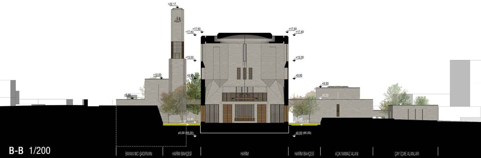 Cami mekanı ile yan işlevler mimari olarak kaynaştırılarak bir bütün olacak şekilde avlu etrafında örgütlenmiştir. Çok amaçlı saçak, son cemaat revağı, erkek şadırvanı, havuzlu sohbet meclisi ile üç tonozlu giriş avlu alanını tanımlar. Erkek şadırvanı ile ilişkili olarak planlanan tuvaletler aynı zamanda çarşıdaki kullanıcıya da hizmet verebilecek şekilde konumlandırılmıştır. Çarşı aksından kadın tuvalet ve şadırvanları için de mahremiyet gereksinimi gözetilerek ayrıca bir giriş tesis edilmiştir. Hemen kadınlar şadırvanı ile ilişkili olarak kurgulanan merdiven ve asansör hanımlar mahfiline erişimi sağlamaktadır. Cami içerisinden de hanımlar mahfiline erişen ayrıca bir merdiven çözülmüştür. Bugün artık ortaya çıkıp geliştiği zamanlardaki ezanın duyurulması maksadıyla Cami mimarisinde yer tayin etme, cami kimliğini güçlü bir şekilde vurgulayan, sembolik nitelik kazanmış minare tasarımın genel karakterine uygun özgün bir şekilde tasarlanmıştır. Minare, park tarafından peyzaj ile birlikte tasarlanan merdivenin karşısında konumlanarak, altındaki tonozlu kapı ile son cemaat revağına açılır.