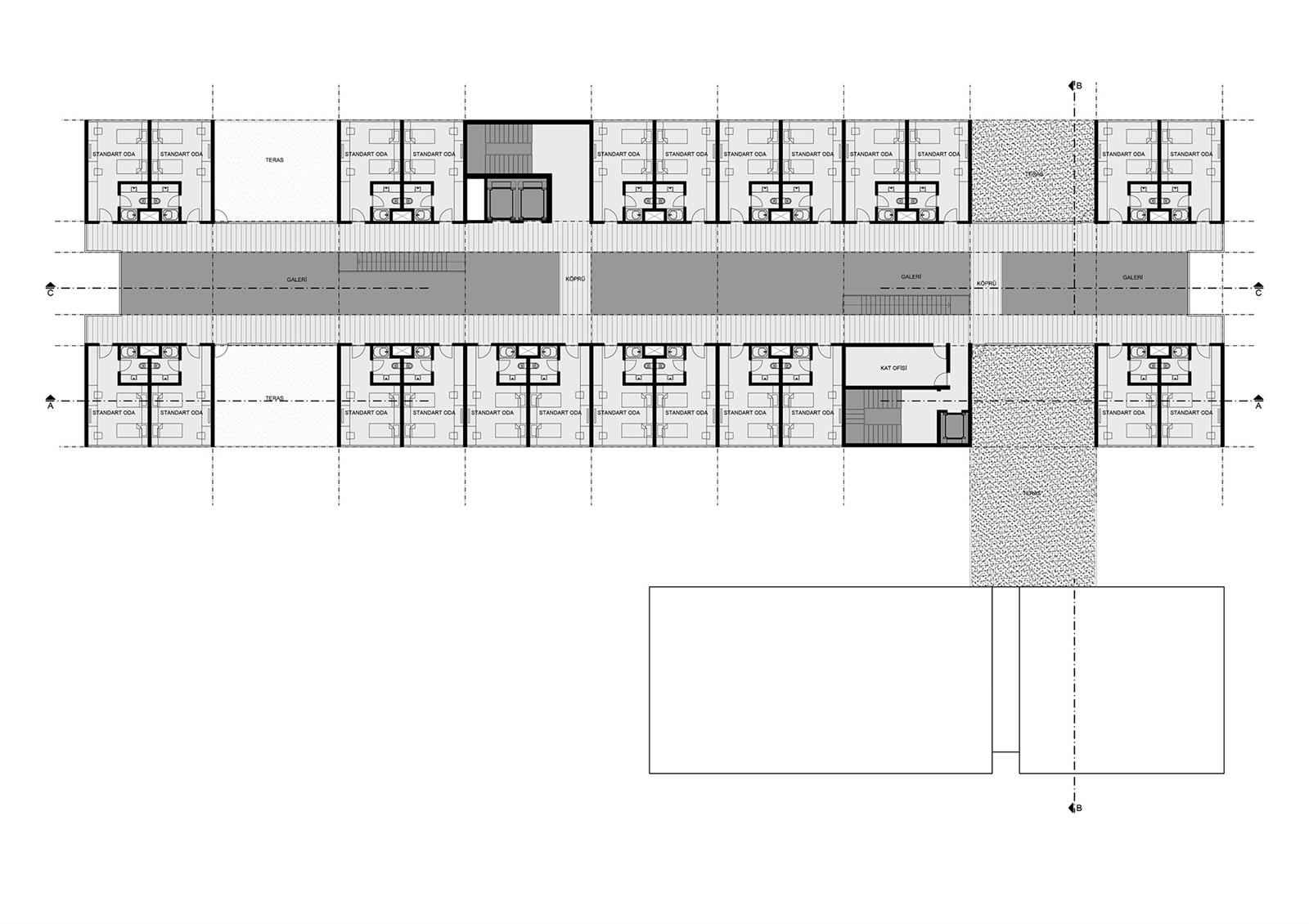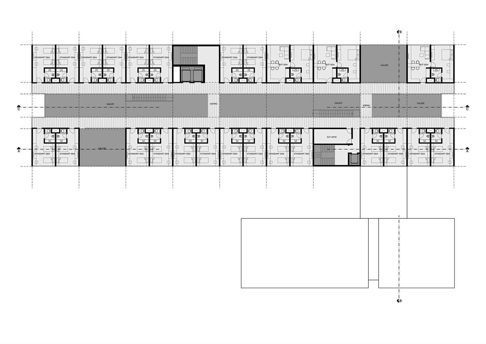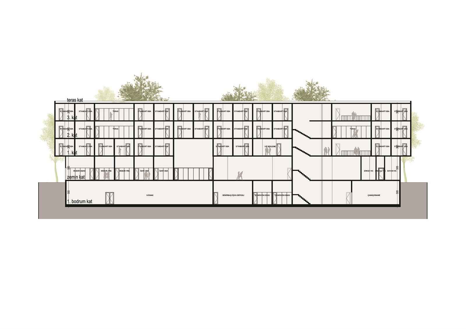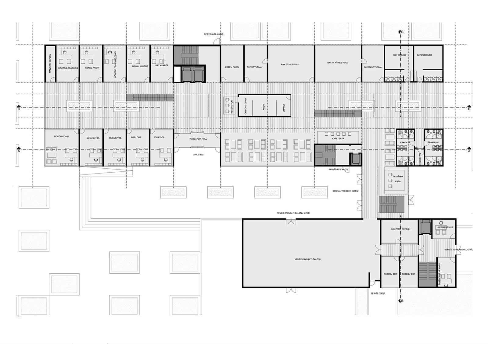 Yapı kütlesinin zemin katında yönetim ve sosyal birimler mevcuttur. Bodrum katta ikincil fonksiyondaki destke, servis ve de teknik mekanlar kurgulanmıştır. Kamuya hizmet edecek ve farklı kullanıcı profine sahip olacak çoklu etkinlik salonu fonksiyon olarak tamamen konaklama biriminden kopartılmıştır. Yarı açık avludan bu çok amaçlı salona ve yemek kahvaltı mekanlarına erişilir. Bu kütleler yatay sirkülasyonu zengin bir köprü ile birbirine bağlanmıştır. Zemin katta açık / yarı açık mekanlar kurgulanmış, kent mobilyaları ve peyzaj tasarımları ile kullanıcı sosyal hayatının zenginleştirilmesi hedeflenmiştir.