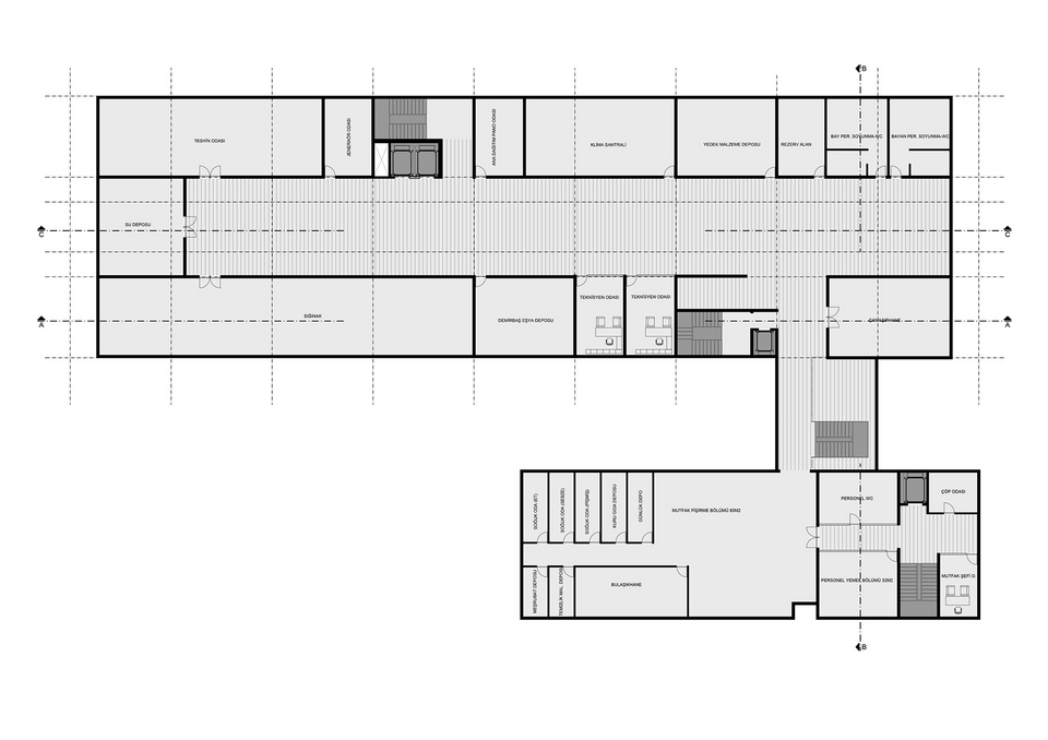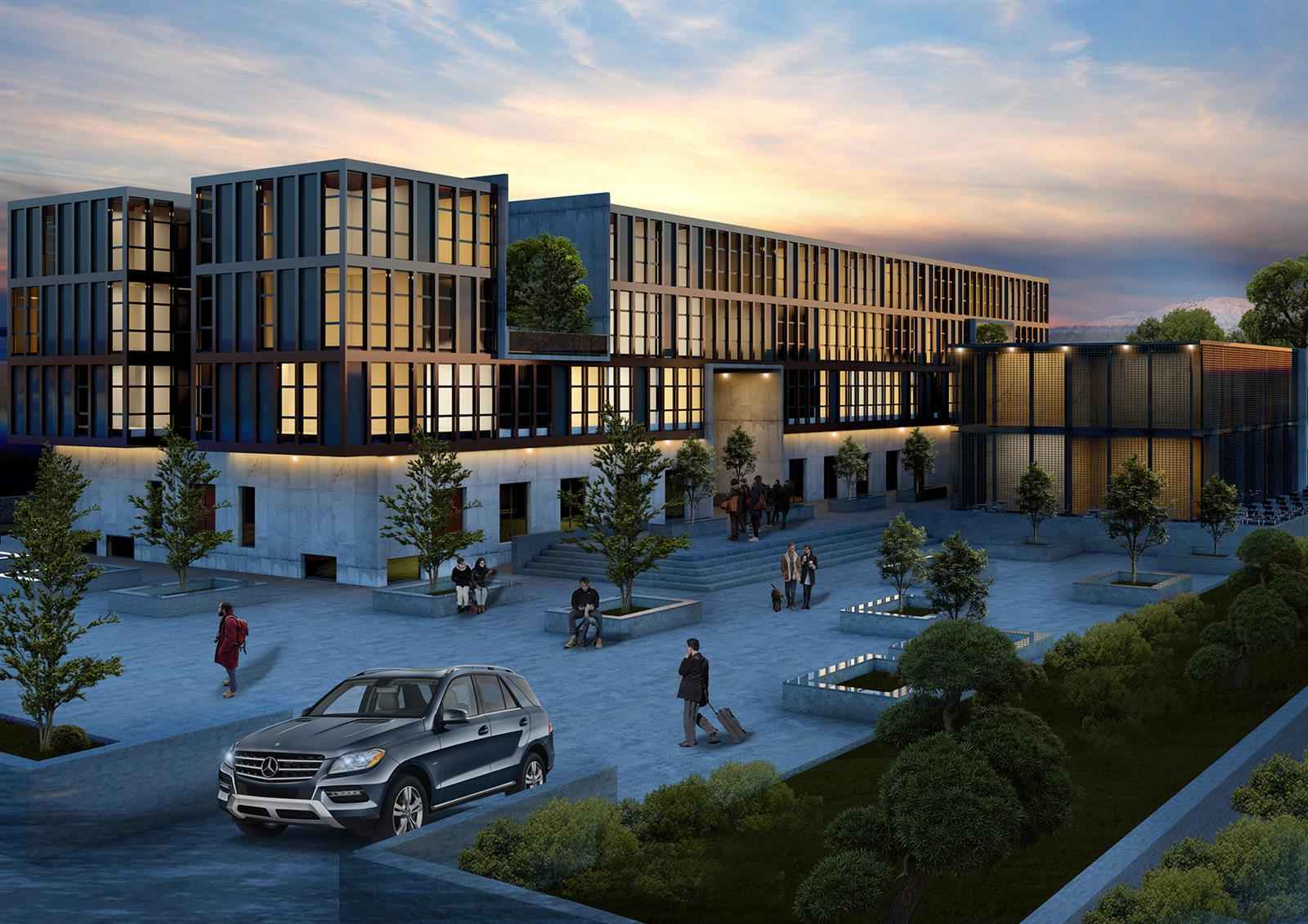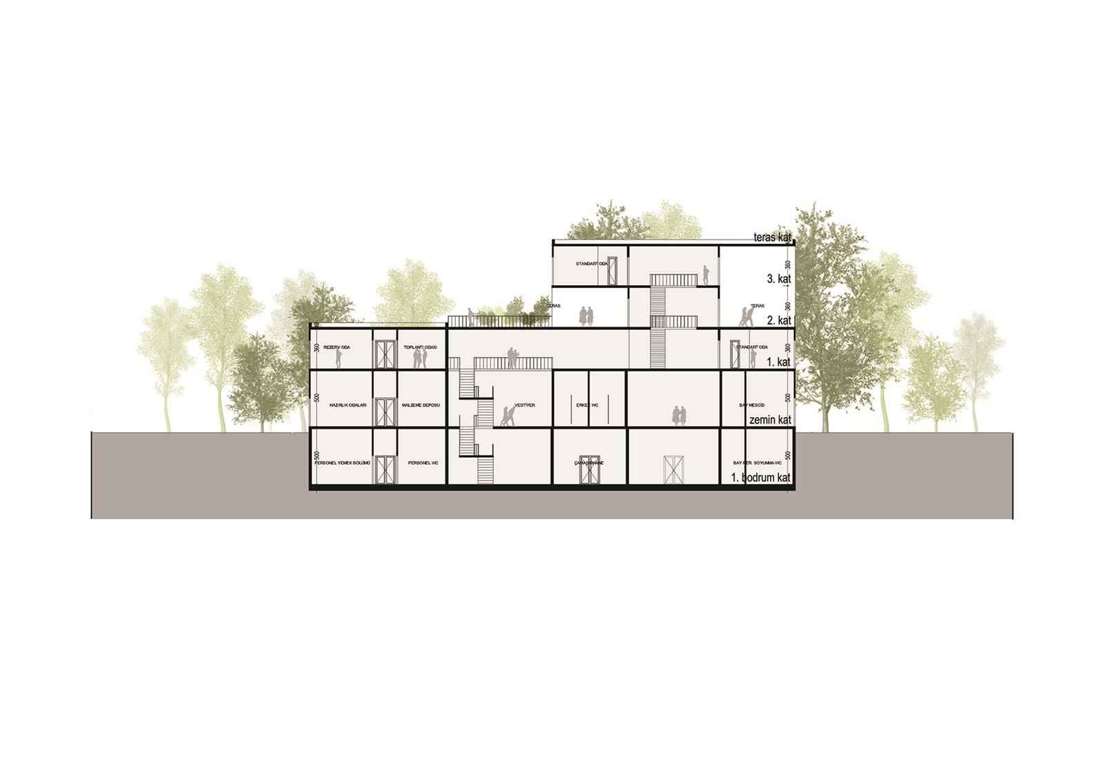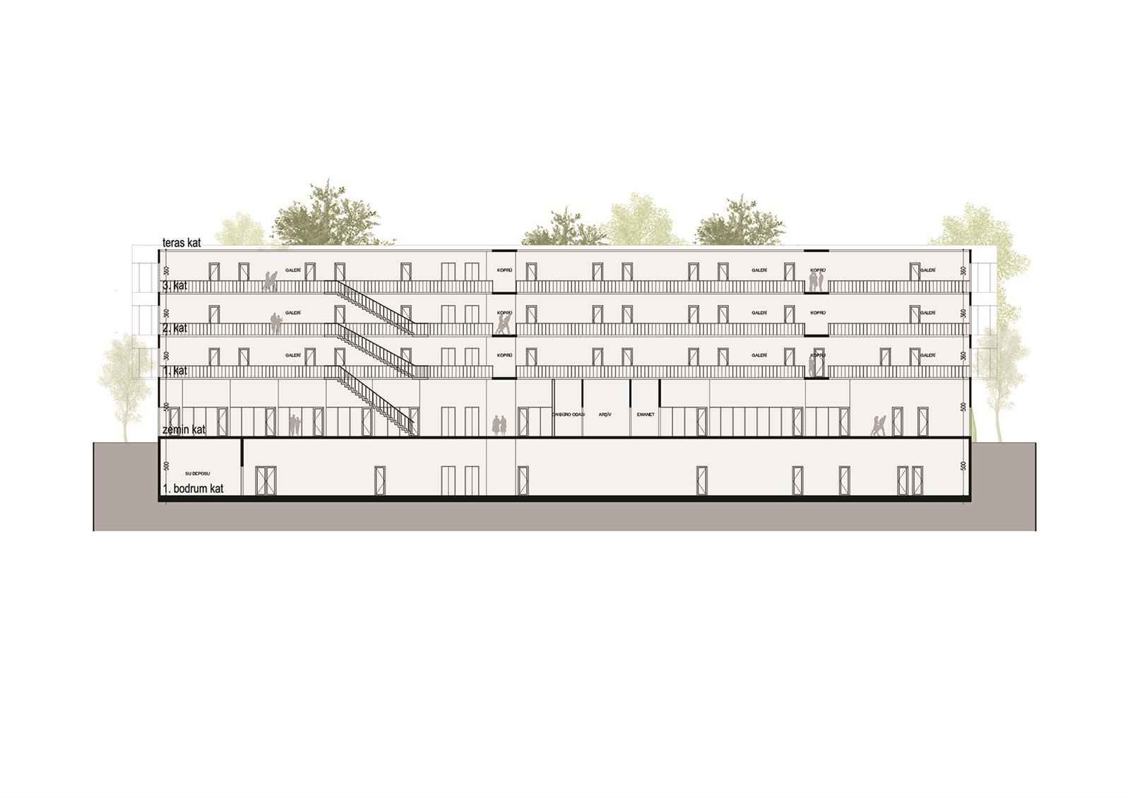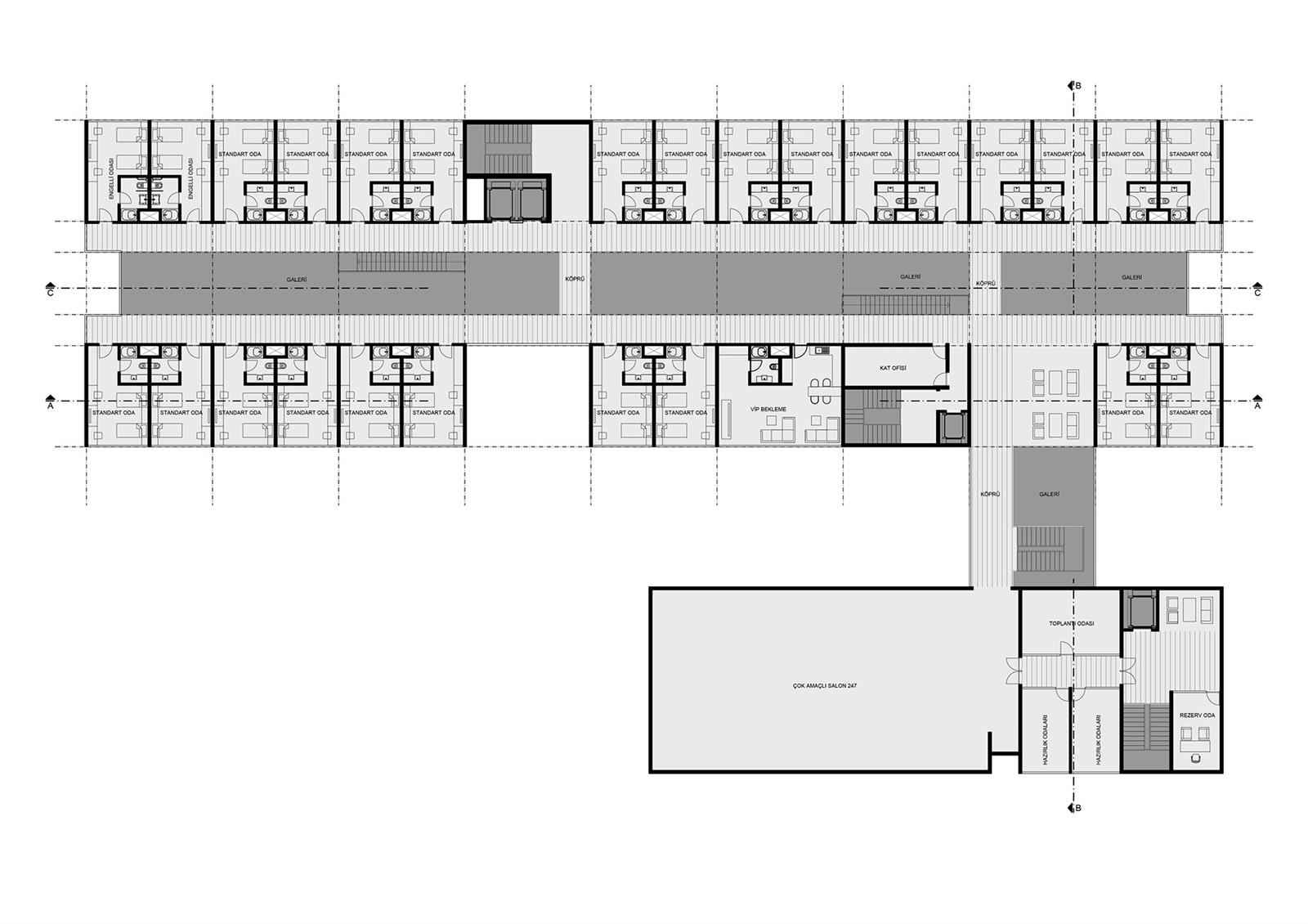 Yapı kütlesinin zemin katında yönetim ve sosyal birimler mevcuttur. Bodrum katta ikincil fonksiyondaki destke, servis ve de teknik mekanlar kurgulanmıştır. Kamuya hizmet edecek ve farklı kullanıcı profine sahip olacak çoklu etkinlik salonu fonksiyon olarak tamamen konaklama biriminden kopartılmıştır. Yarı açık avludan bu çok amaçlı salona ve yemek kahvaltı mekanlarına erişilir. Bu kütleler yatay sirkülasyonu zengin bir köprü ile birbirine bağlanmıştır. Zemin katta açık / yarı açık mekanlar kurgulanmış, kent mobilyaları ve peyzaj tasarımları ile kullanıcı sosyal hayatının zenginleştirilmesi hedeflenmiştir.