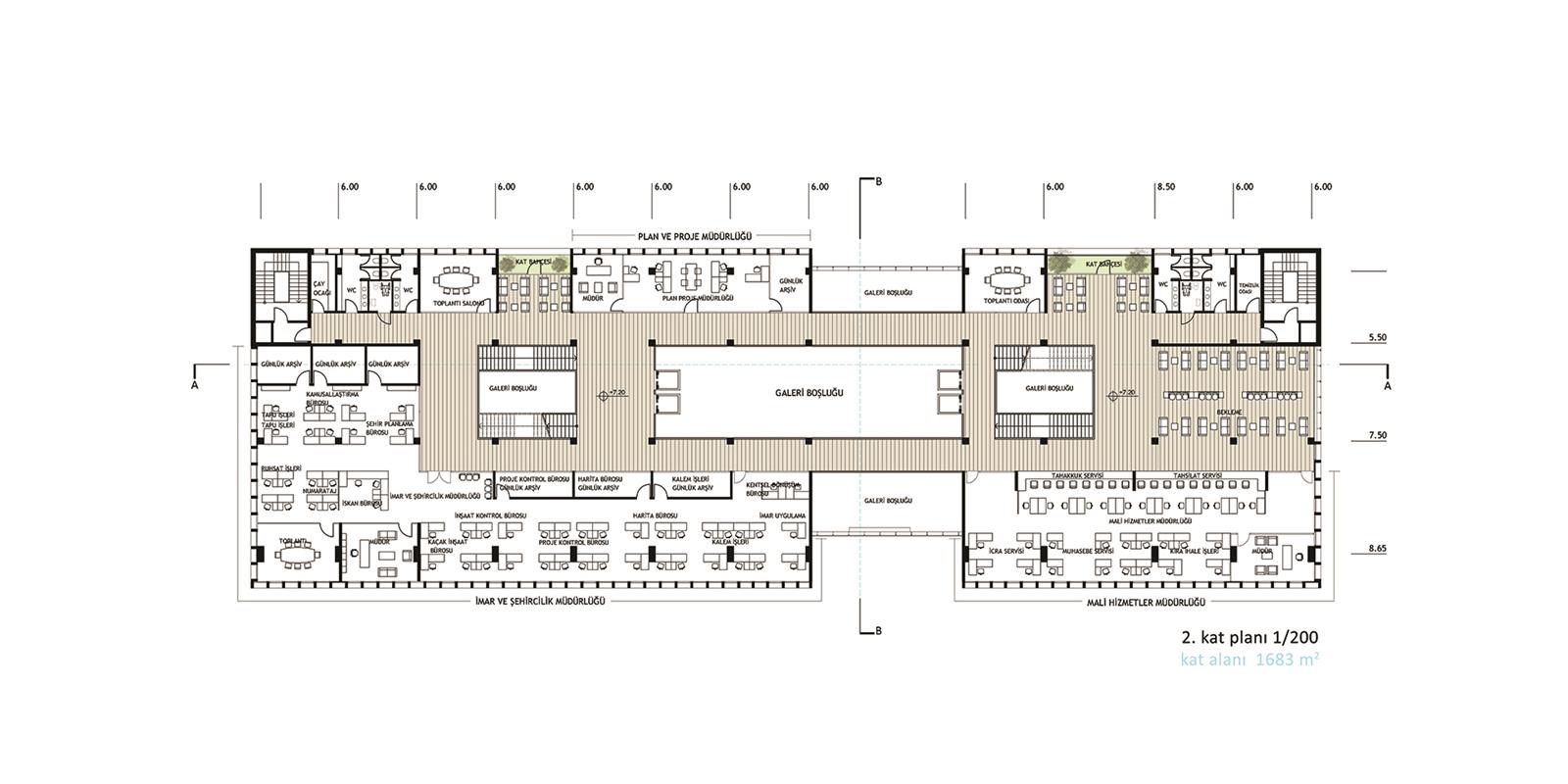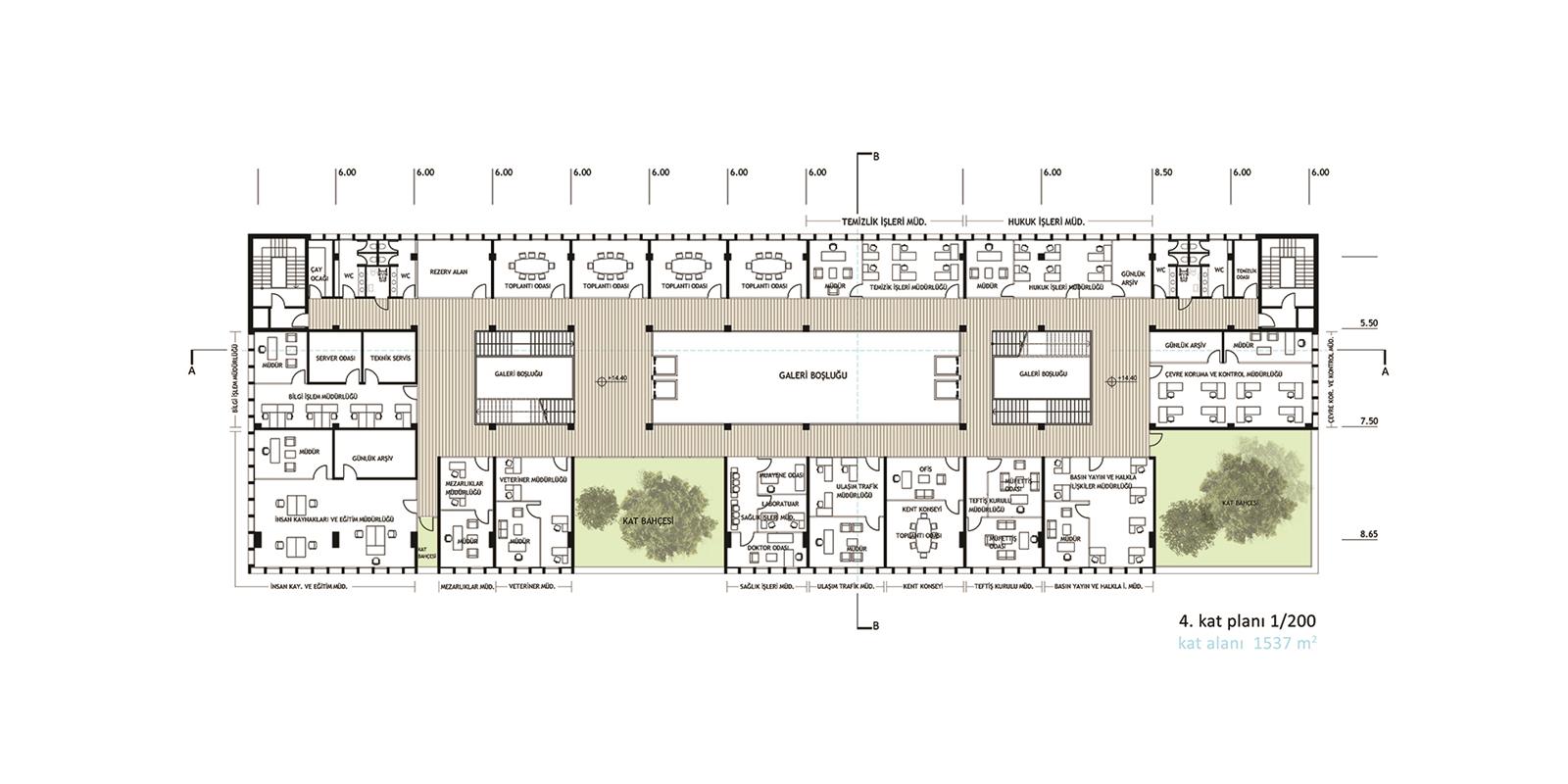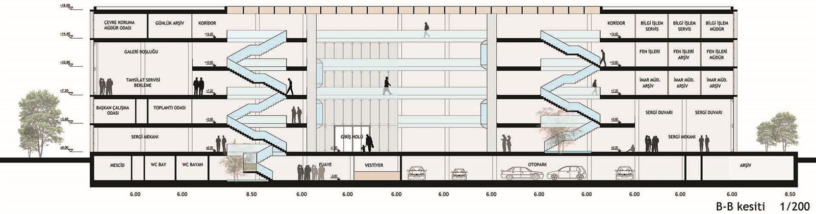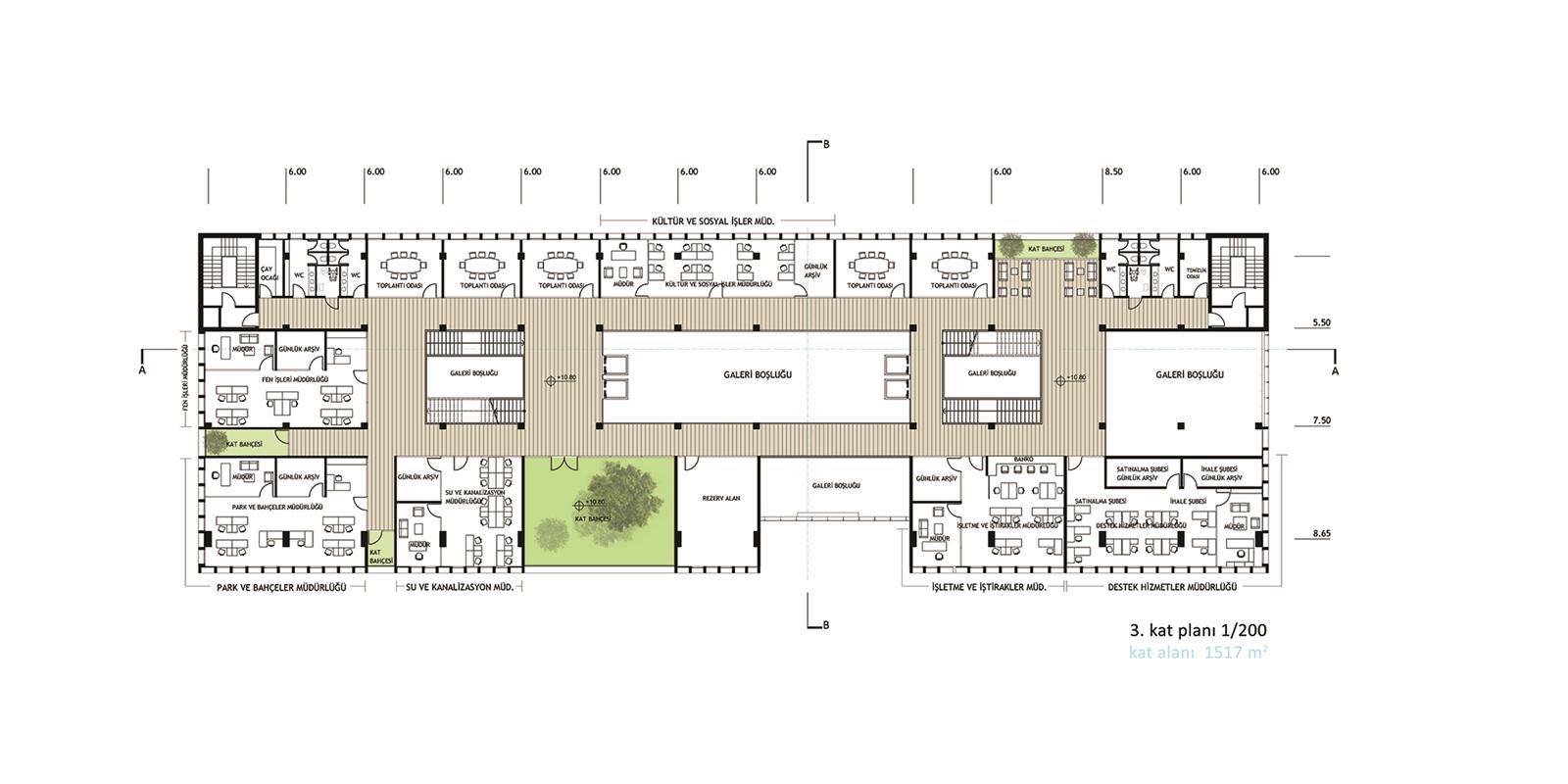 Mekan kurgusu temel olarak atriyumun etrafına sıralanmış net ve yalın birimlerden oluşturuldu. Yatay sirkülasyon atriyum etrafındaki rahat koridorlarla sağlanırken, düşey sirkülasyon belediyenin iki noktasındaki merdiven ve asansörlerle sağlandı. Her katta yapılan kat bahçeleri ile çalışanların ve ziyaretçilerin nefes alacakları mekanlar oluşturuldu