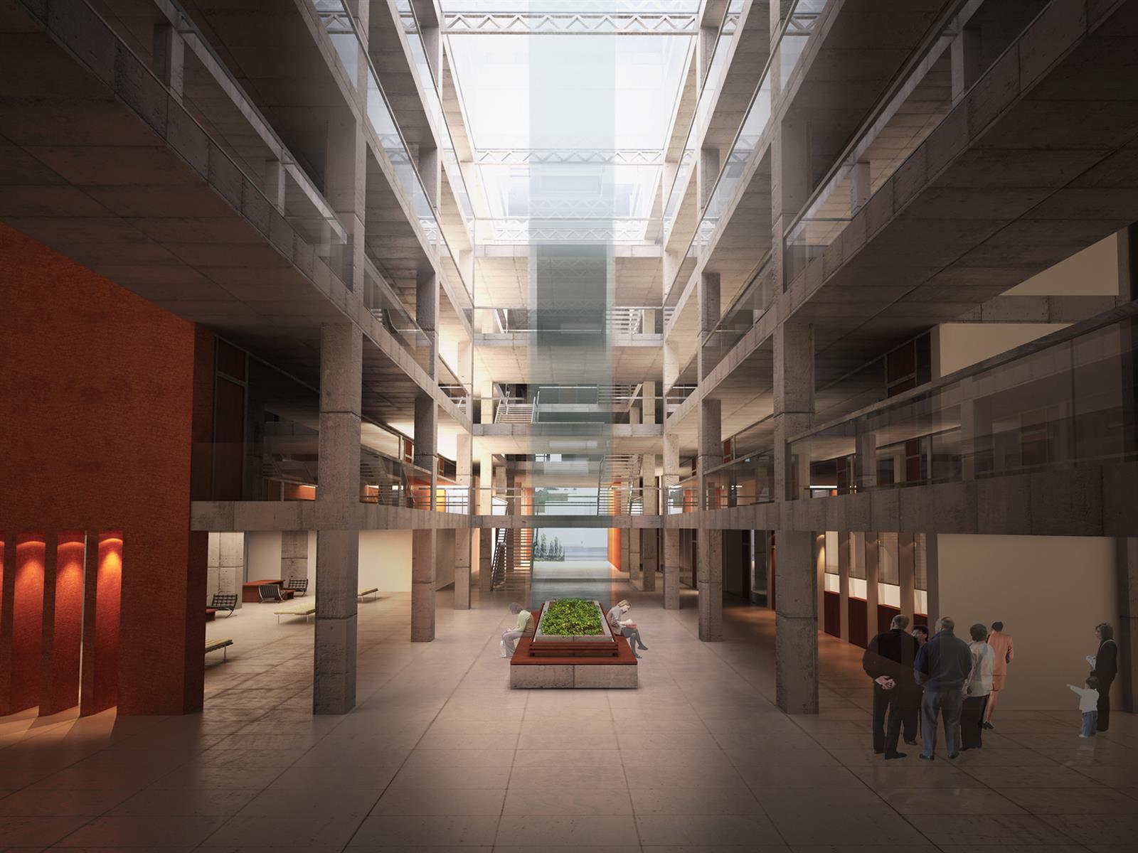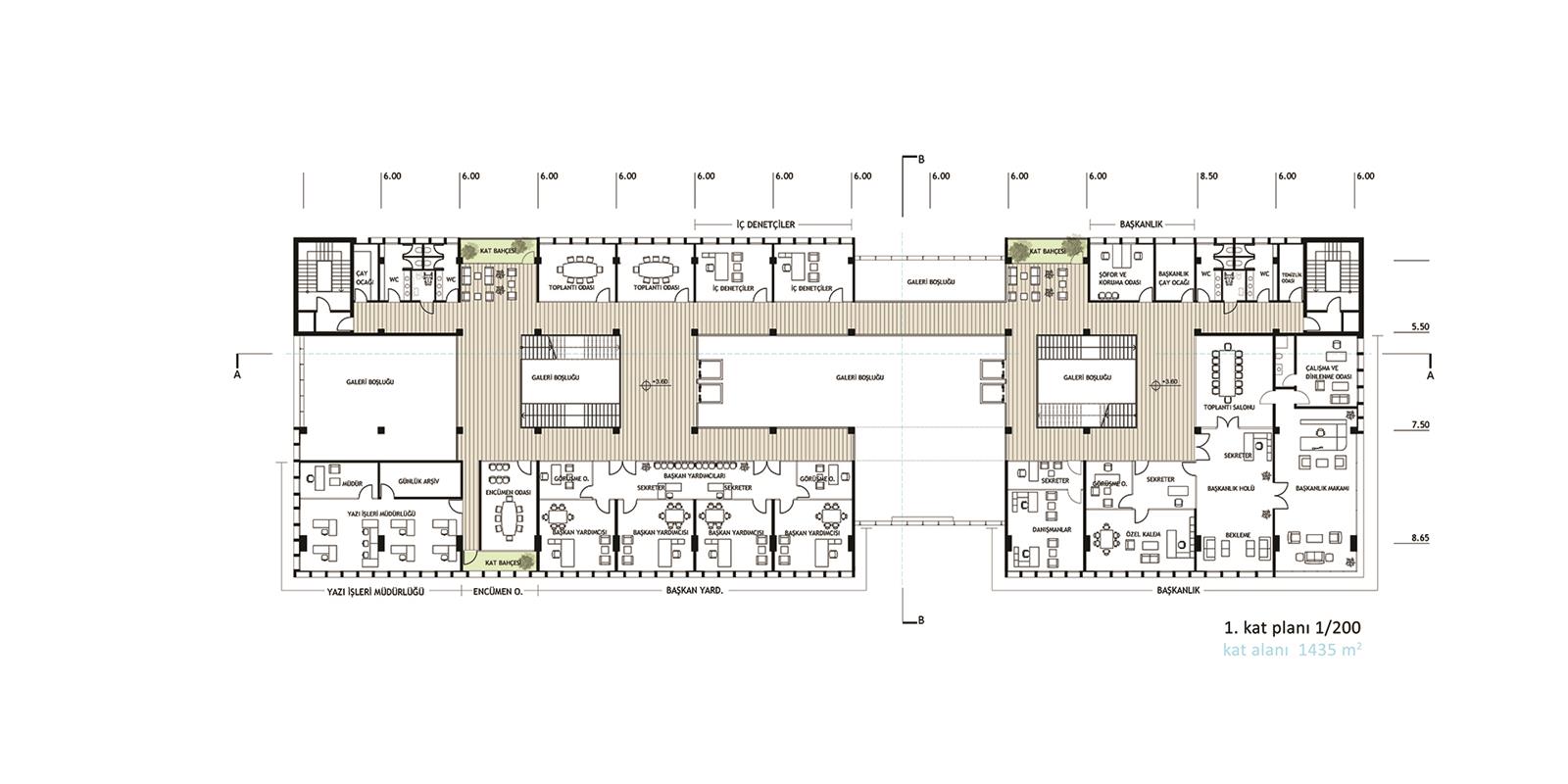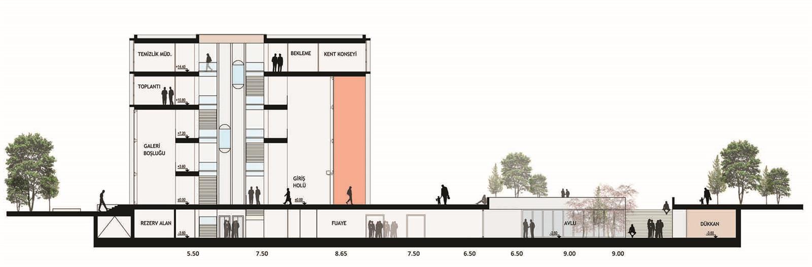 Mekan kurgusu temel olarak atriyumun etrafına sıralanmış net ve yalın birimlerden oluşturuldu. Yatay sirkülasyon atriyum etrafındaki rahat koridorlarla sağlanırken, düşey sirkülasyon belediyenin iki noktasındaki merdiven ve asansörlerle sağlandı. Her katta yapılan kat bahçeleri ile çalışanların ve ziyaretçilerin nefes alacakları mekanlar oluşturuldu