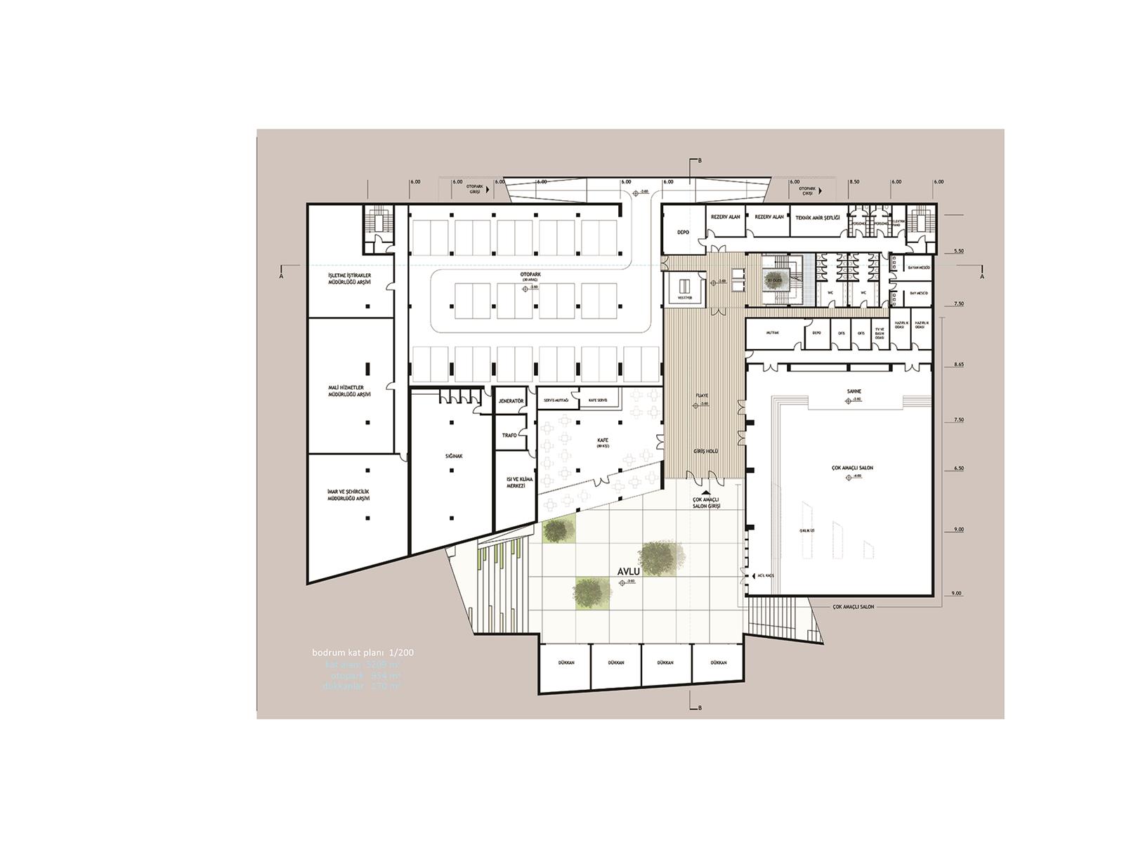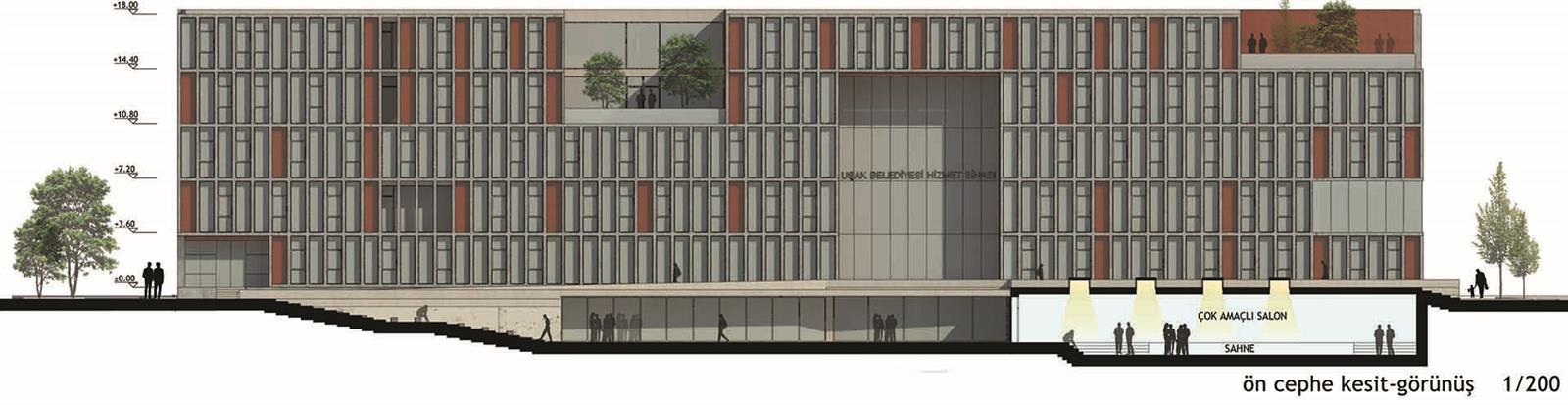 Belediye binasının bodrum katında oluşturulan ve kent meydanının avlusuna açılan kafe, çok amaçlı salon, fuaye ve dükkanlar ile yapının kentli ile kurduğu ilişki daha da güçlendirilmiştir. Belediye binasının cepheleri, tarihi uşak evinin pencere boşluk oranlarının yorumlanması ile elde edilen ızgara sisteminden oluşturuldu. Bu prekast ızgara bölgenin önceki sanayi işlevine vurgu yapan corten malzemesi ile birlikte bir kompozisyon oluşturdu ve prekast elemanlardaki derinlik ile gün ışığının kontrollü bir şekilde içeriye alınması sağlandı.