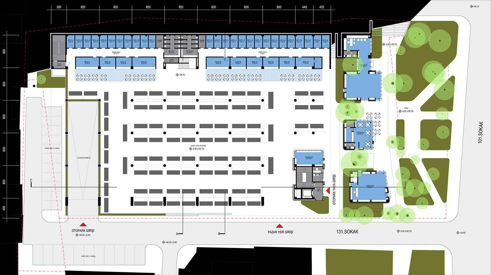Otoparkın girişi 131. sokak üzerinden parselin güneybatı köşesinden verilir. Açık otopark yerleri düzenlenir. Pazaryeri kotunda parselin kuzeyine yaslanan birimlere ticaret fonksiyonu verilir. Cadde ve park ile ilişkili ticaret dizi oluşturulur. Ticaretler mevcut korunan ağaçlara göre şekil alırlar.