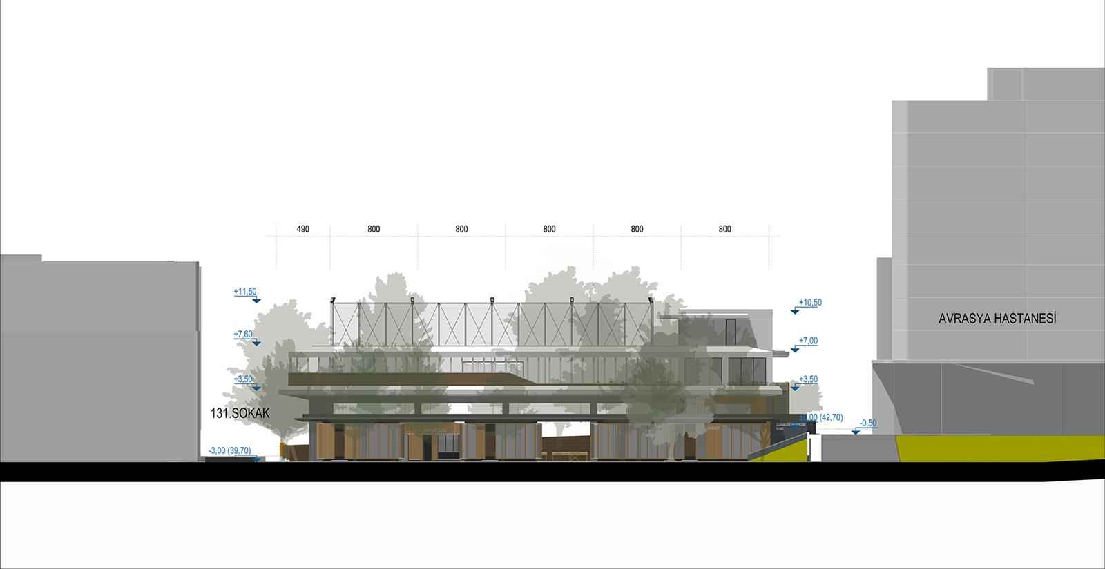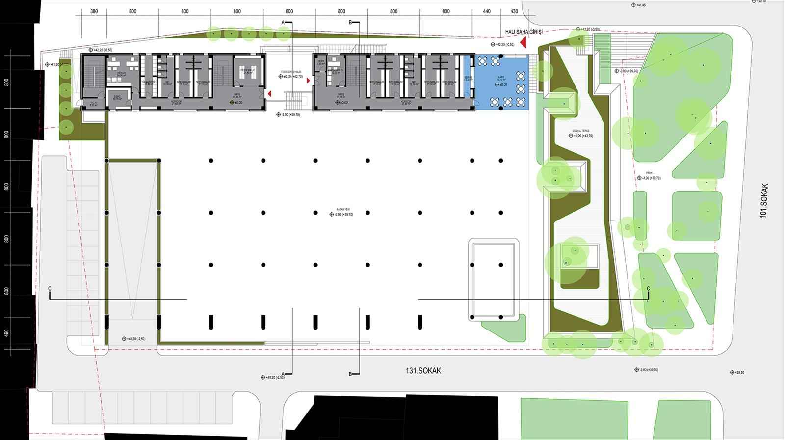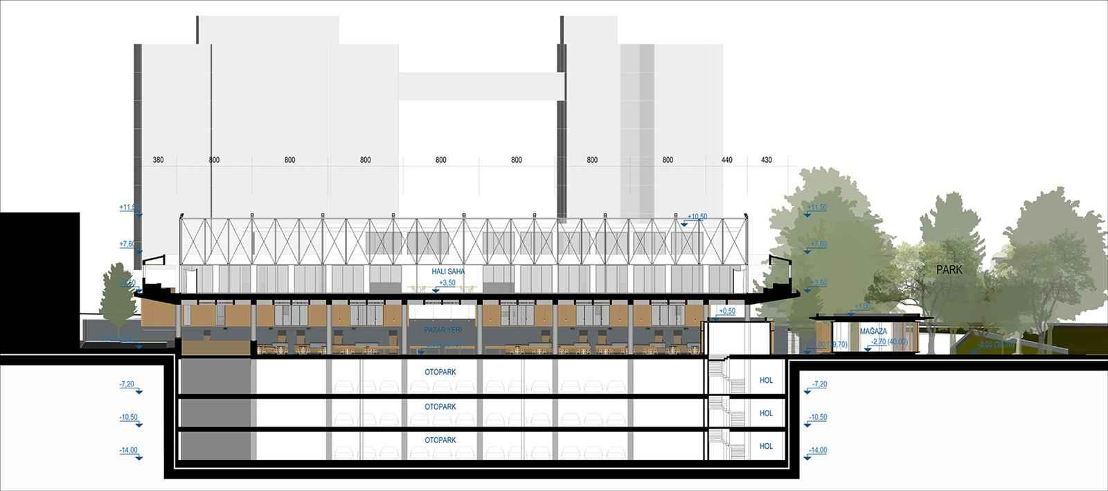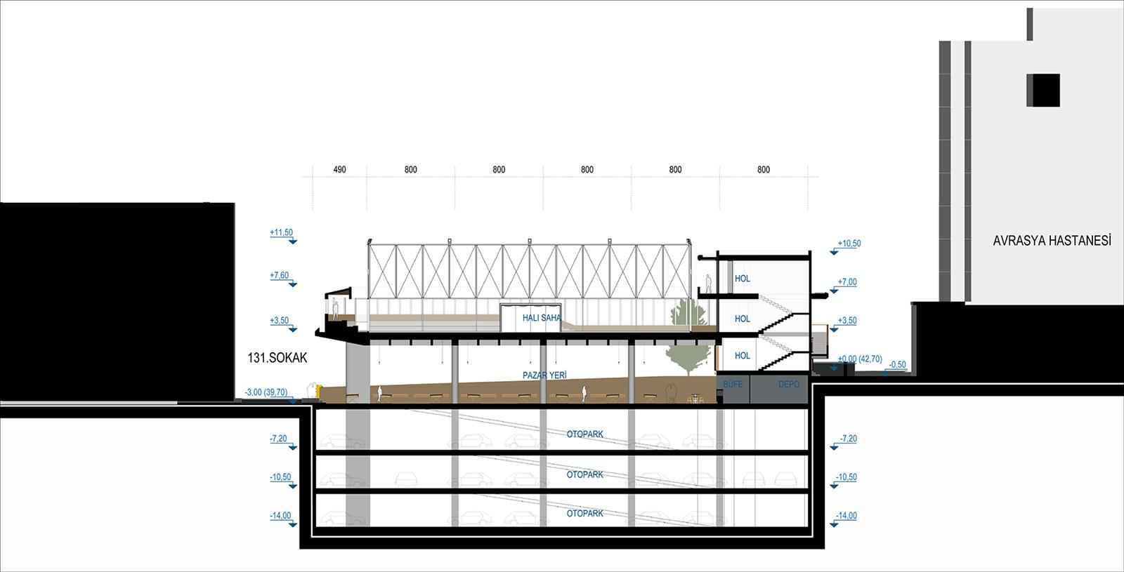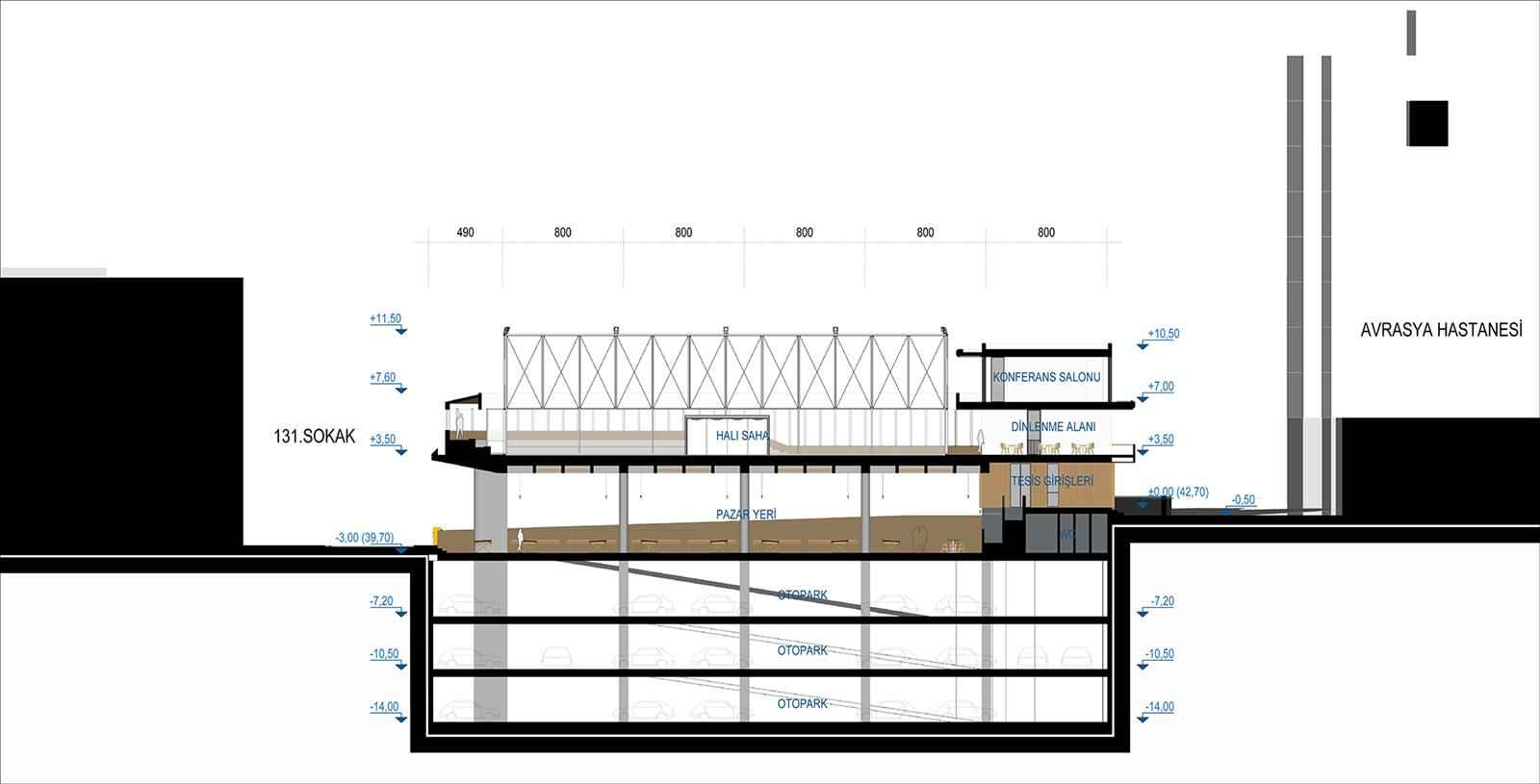 Arazi düşük yol seviyesine göre tesviye edilir. Çevre yapılaşmadan ve park tarafından çekilerek yerleşme alanı belirlenir. Ayaklar üstünde yükselen platform halı saha zeminini oluşturur. Pazaryeri düzlemi yol ile aynı seviyede oluşturulur. Halısaha tesisleri Avrasya Hastanesi’ne doğru yaslanır. Pazar yeri ile halı sahanın çalıştığı aralıklar birbirinden ayrılır. Zemin altında 3 katlı kapalı otopark tesis edilir