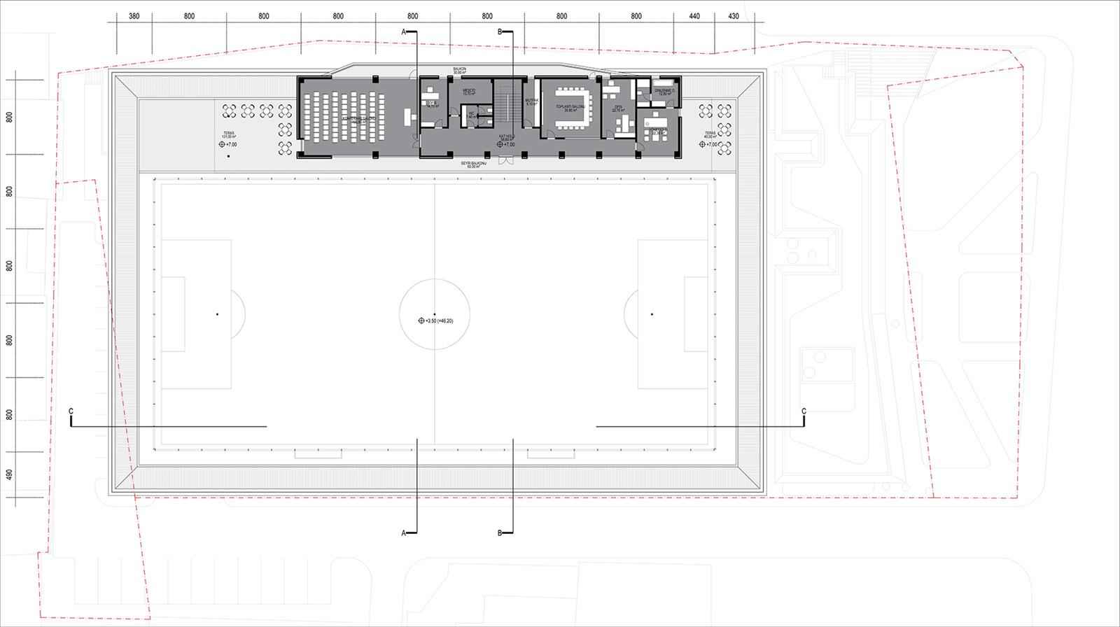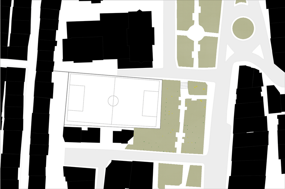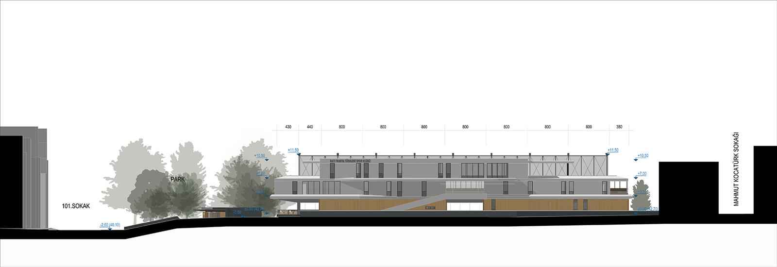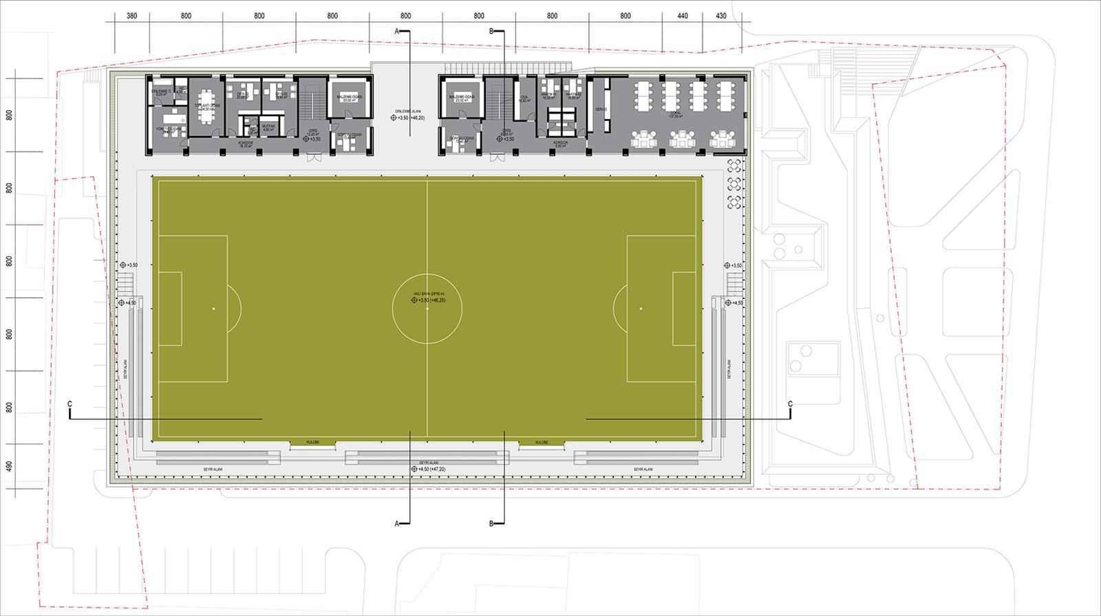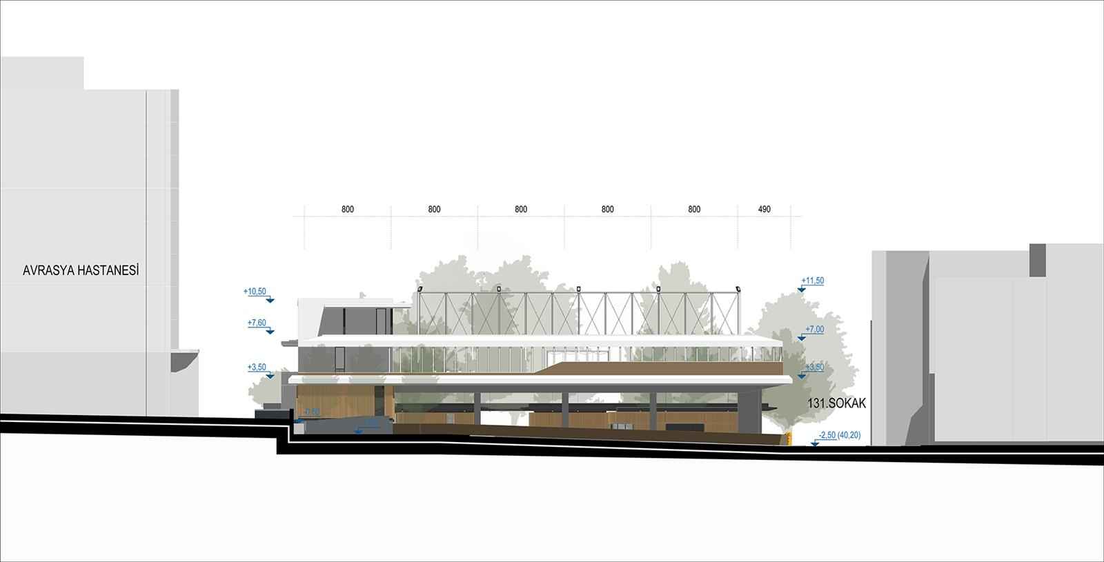 Arazi düşük yol seviyesine göre tesviye edilir. Çevre yapılaşmadan ve park tarafından çekilerek yerleşme alanı belirlenir. Ayaklar üstünde yükselen platform halı saha zeminini oluşturur. Pazaryeri düzlemi yol ile aynı seviyede oluşturulur. Halısaha tesisleri Avrasya Hastanesi’ne doğru yaslanır. Pazar yeri ile halı sahanın çalıştığı aralıklar birbirinden ayrılır. Zemin altında 3 katlı kapalı otopark tesis edilir