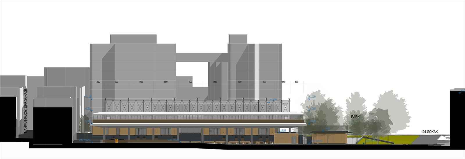 Tasarım alanında aynı zamanda tam kapasiteli bir semt pazarı ve de kapalı otopark istenmektedir. Tasarım alanı irdelendiğinde yapılaşılacak yer mevcut bir park, konut blokları ve sirkülasyonu yoğun bir özel hastane ile çevrilidir. Parsel iki ayrı yol / kaldırım kotundan 2,5 metre kot farkına sahiptir. Bu kapsamı geniş ihtiyaç programı için bir fırsat sunmaktadır.
