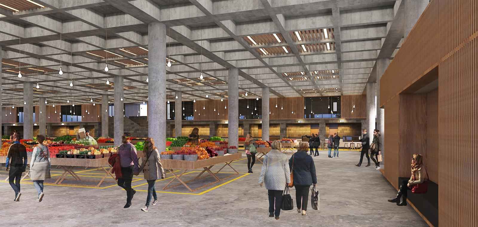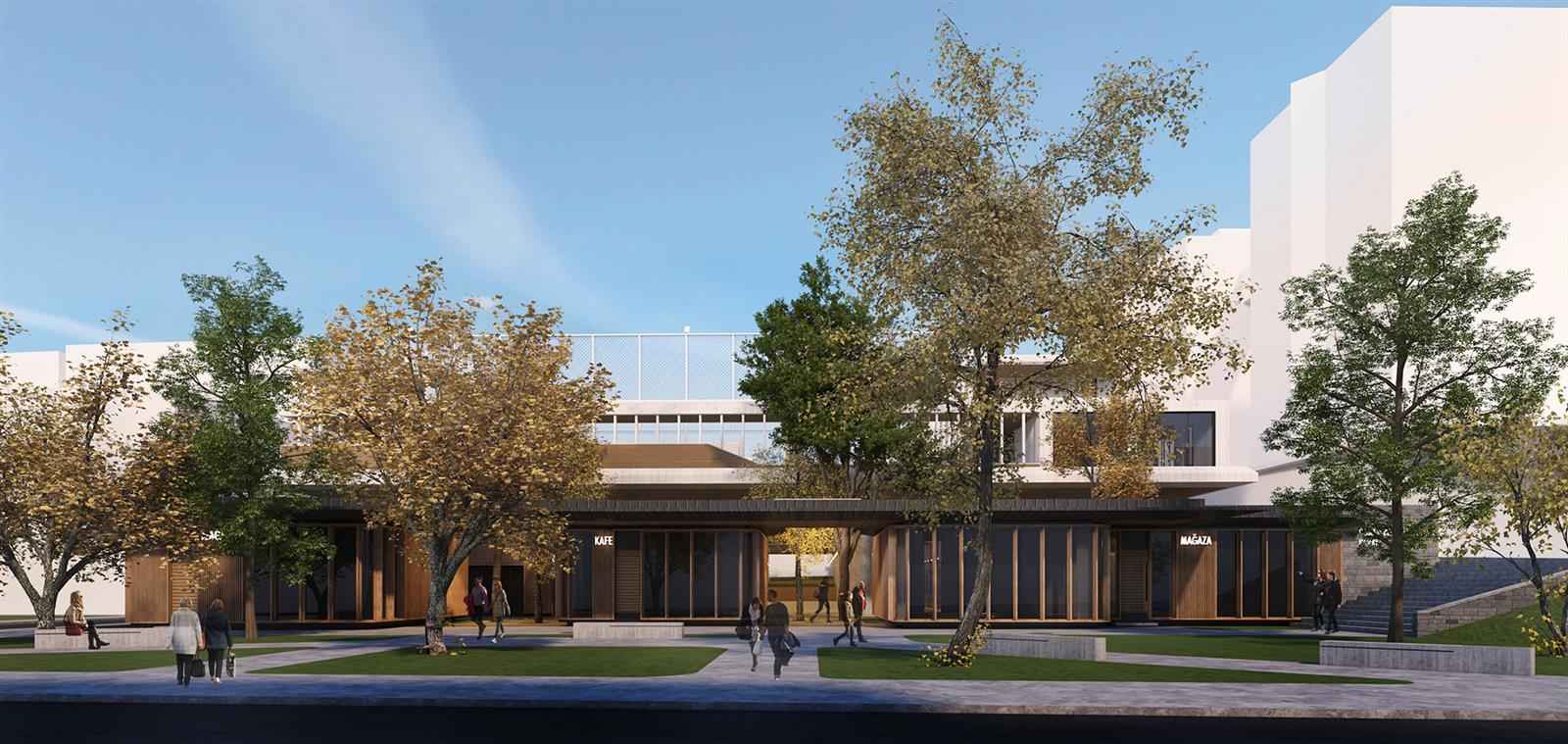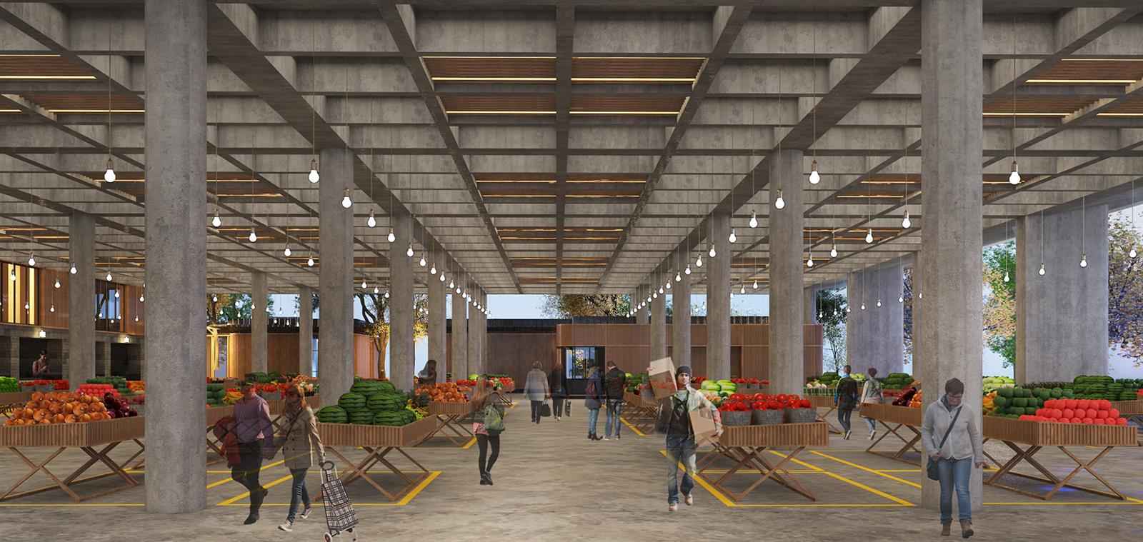 Ağaçların arasına sızarak yerleşen ticari birimler aynı zamanda pazaryerinin park tarafından erişilmesine olanak sağlar ve daha geçirgen bir durum elde edilir.
